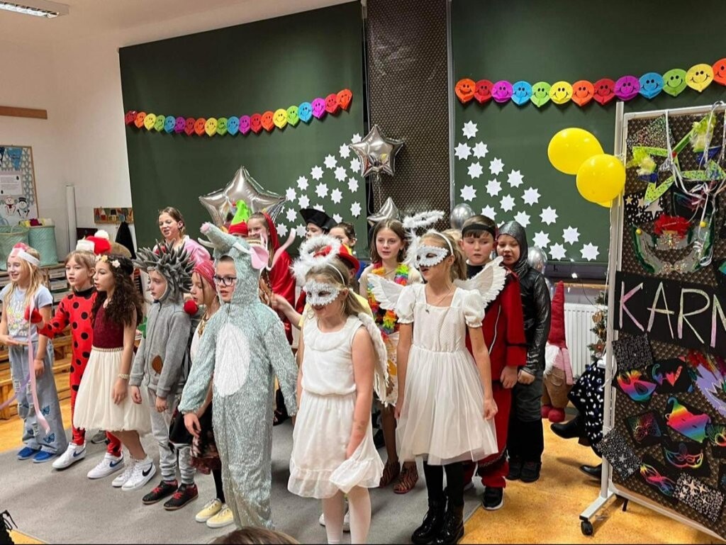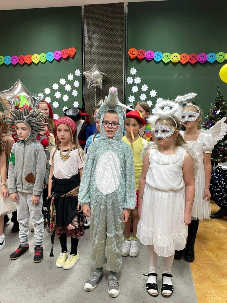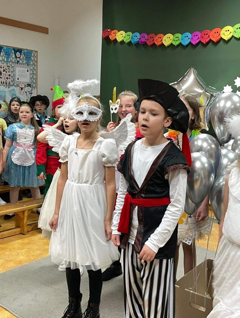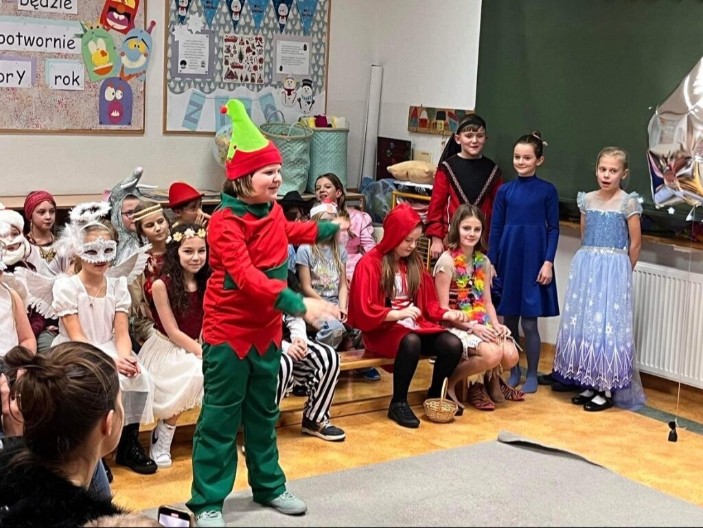 Na spotkanie z rodzicami uczniowie klasy III B wraz z wychowawczynią przygotowali piękne przedstawienie zatytułowane: „Karnawał". Trzecioklasiści powitali rodziców piosenką z akademii Pana Kleksa - "Witajcie w naszej bajce" i zaprosili do wspólnej zabawy. Dzieci przebrały się za postacie z bajek. Pojawiły się: Czerwony Kapturek, Pinokio, Vaiana, Elza i Roszpunka. Był także słoń, cyganka, rycerz , anioły, elf, pirat i wiele innych pięknych bajkowych postaci. Uczniowie zaprezentowali swoje niezwykłe umiejętności recytatorskie, wokalne, taneczne i jak na czas karnawału przystało, zatańczyli energetyczną salsę. Przedstawienie odbyło się w pięknej scenografii, którą uczniowie przygotowali sami. Na zakończenie przedstawienia Hania pięknie wyrecytowała: