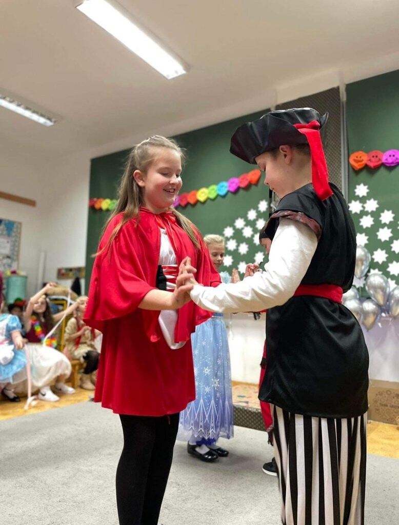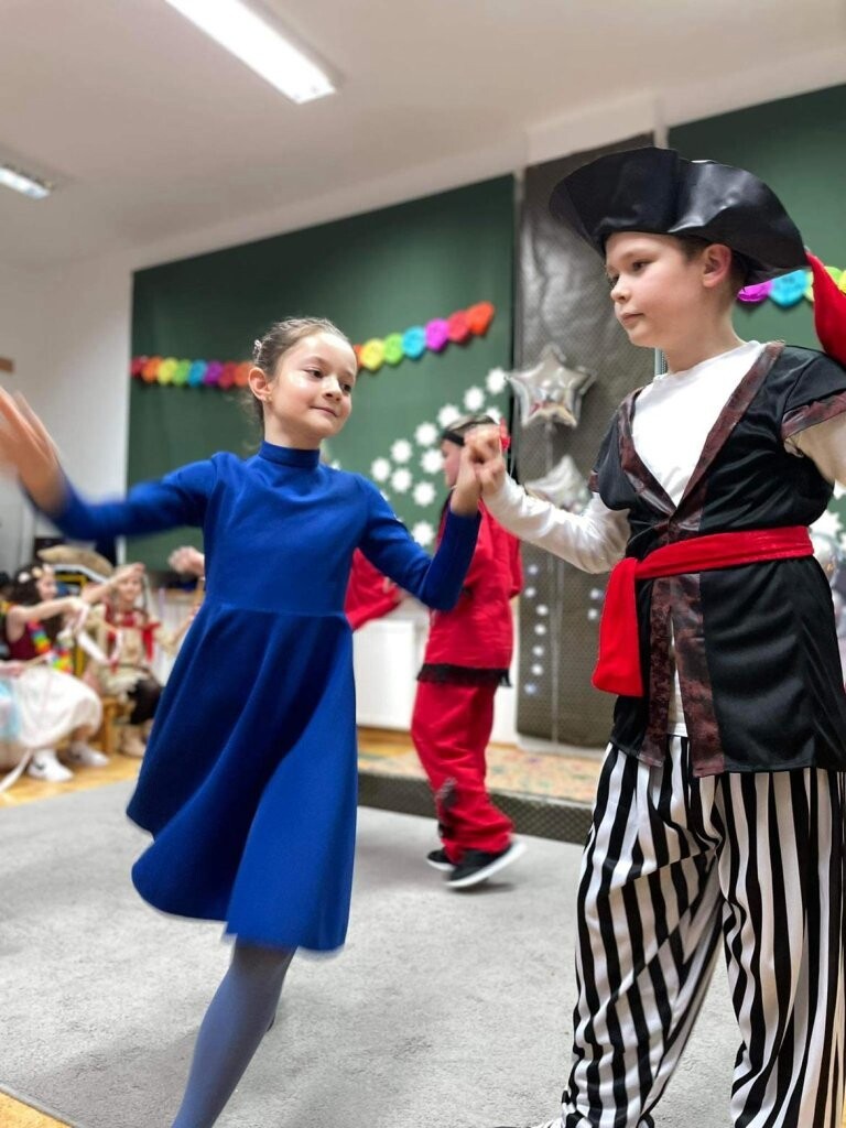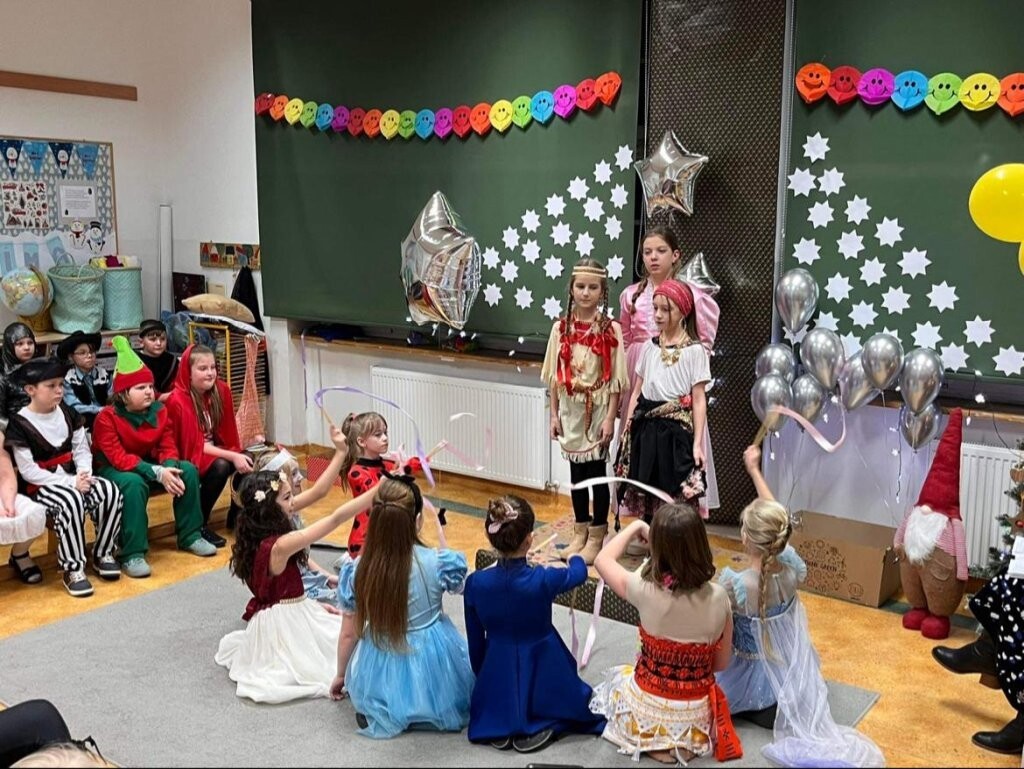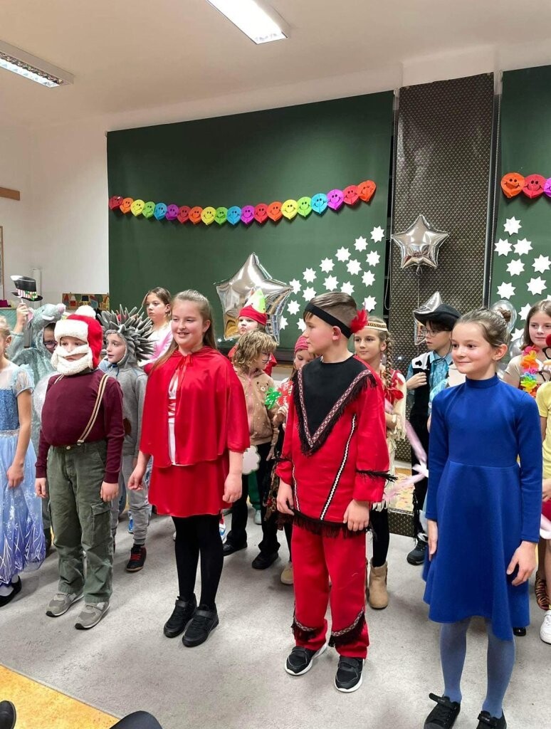 Na spotkanie z rodzicami uczniowie klasy III B wraz z wychowawczynią przygotowali piękne przedstawienie zatytułowane: „Karnawał". Trzecioklasiści powitali rodziców piosenką z akademii Pana Kleksa - "Witajcie w naszej bajce" i zaprosili do wspólnej zabawy. Dzieci przebrały się za postacie z bajek. Pojawiły się: Czerwony Kapturek, Pinokio, Vaiana, Elza i Roszpunka. Był także słoń, cyganka, rycerz , anioły, elf, pirat i wiele innych pięknych bajkowych postaci. Uczniowie zaprezentowali swoje niezwykłe umiejętności recytatorskie, wokalne, taneczne i jak na czas karnawału przystało, zatańczyli energetyczną salsę. Przedstawienie odbyło się w pięknej scenografii, którą uczniowie przygotowali sami. Na zakończenie przedstawienia Hania pięknie wyrecytowała: