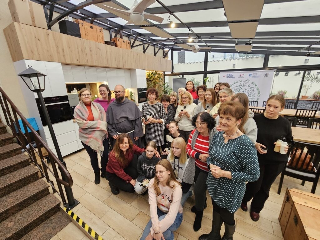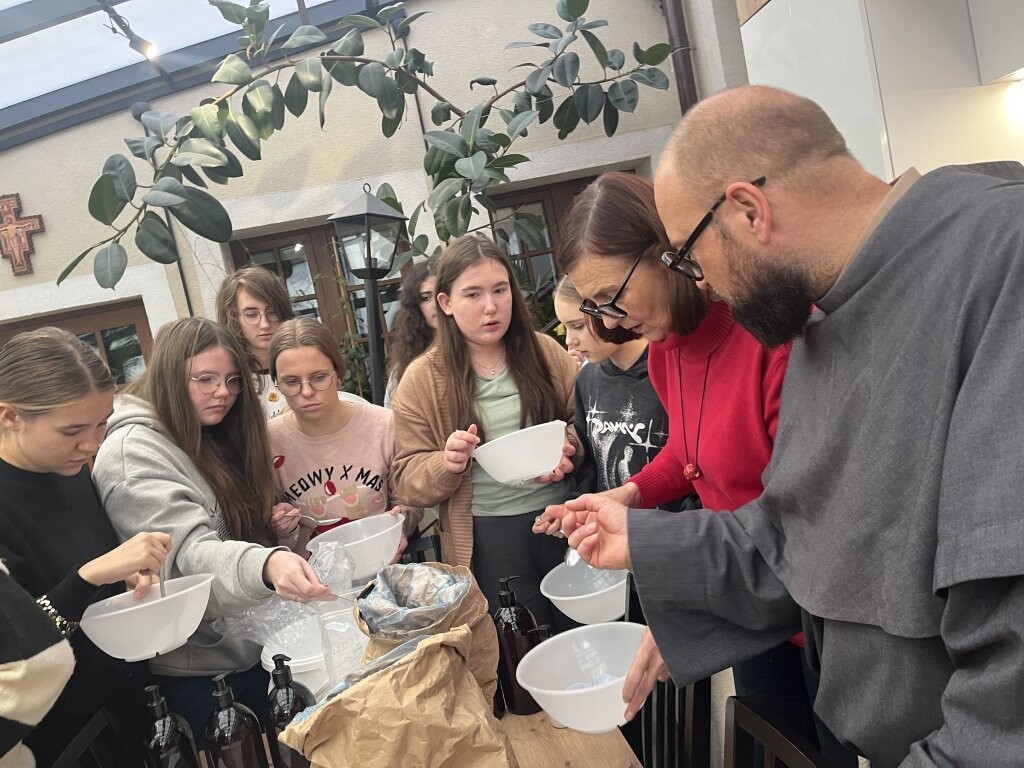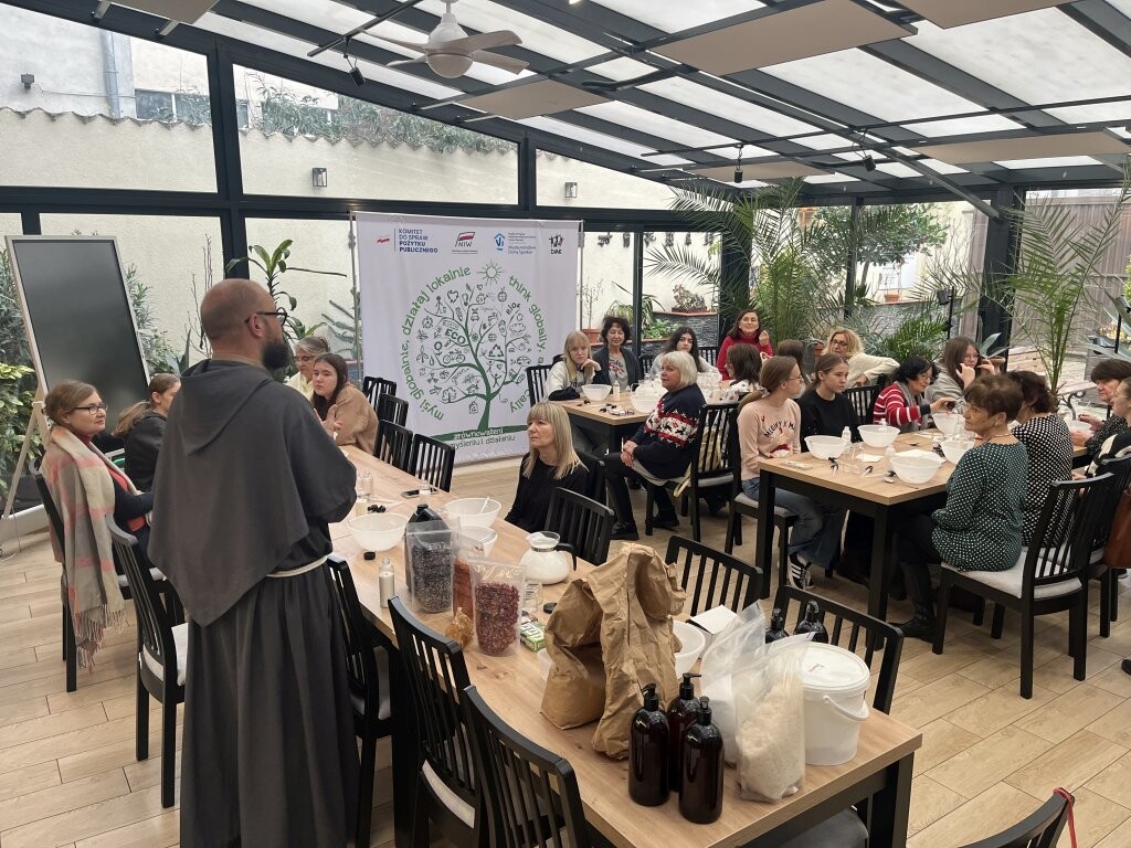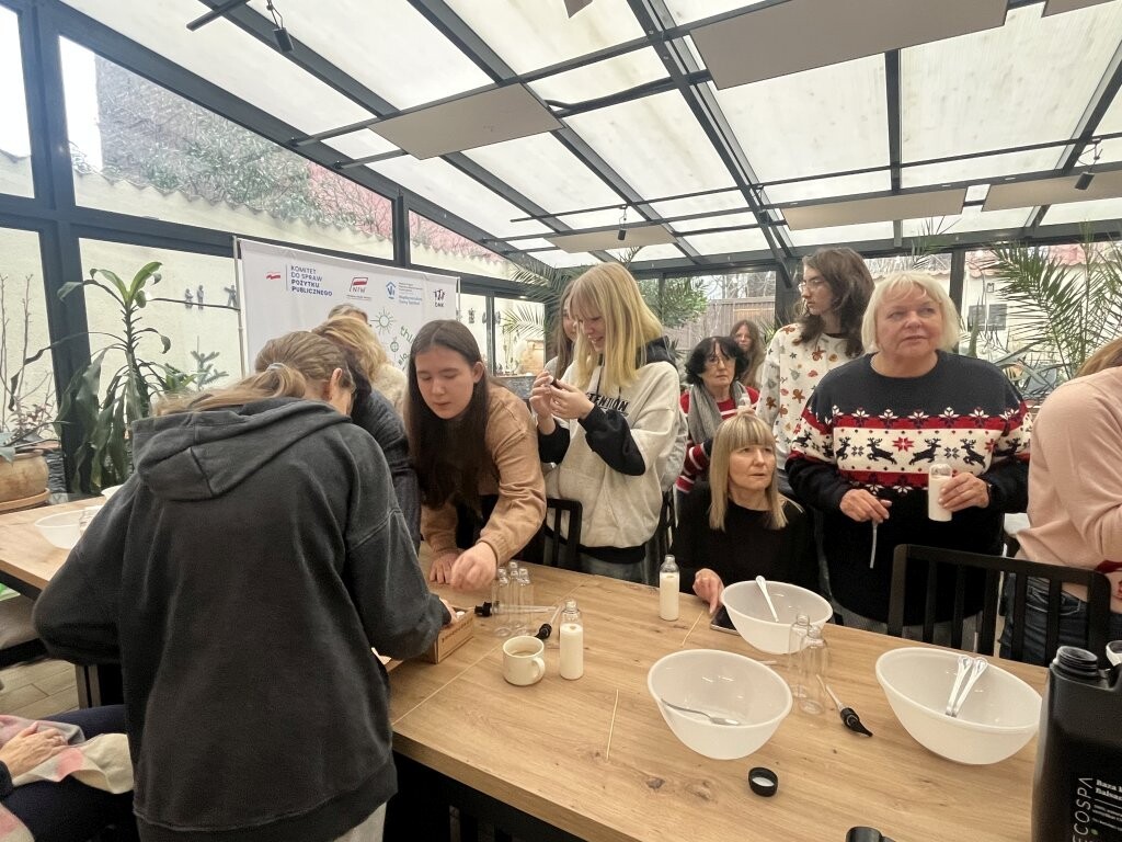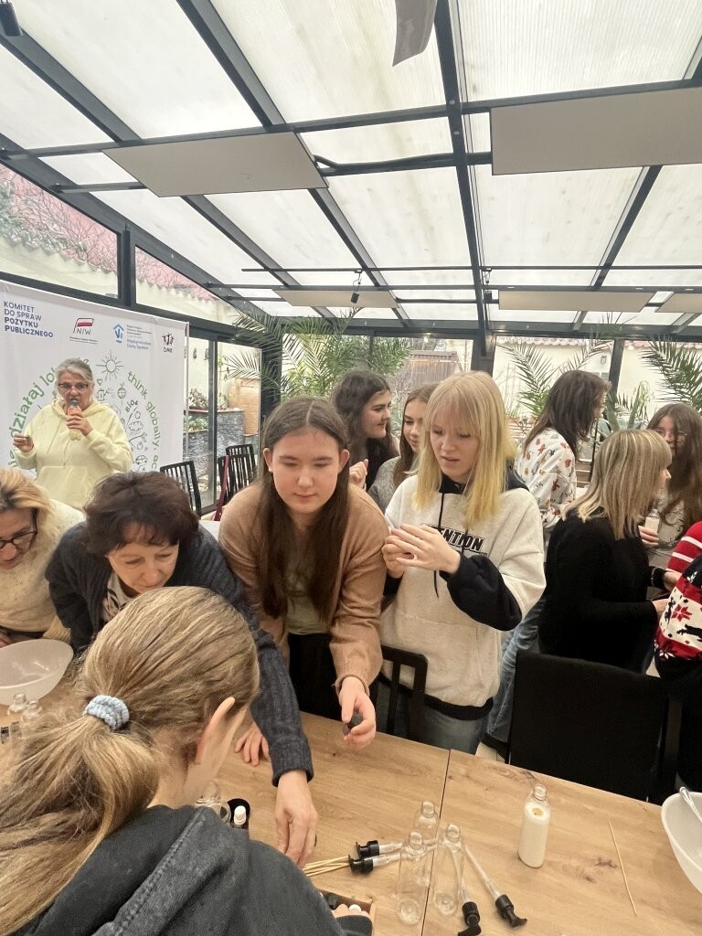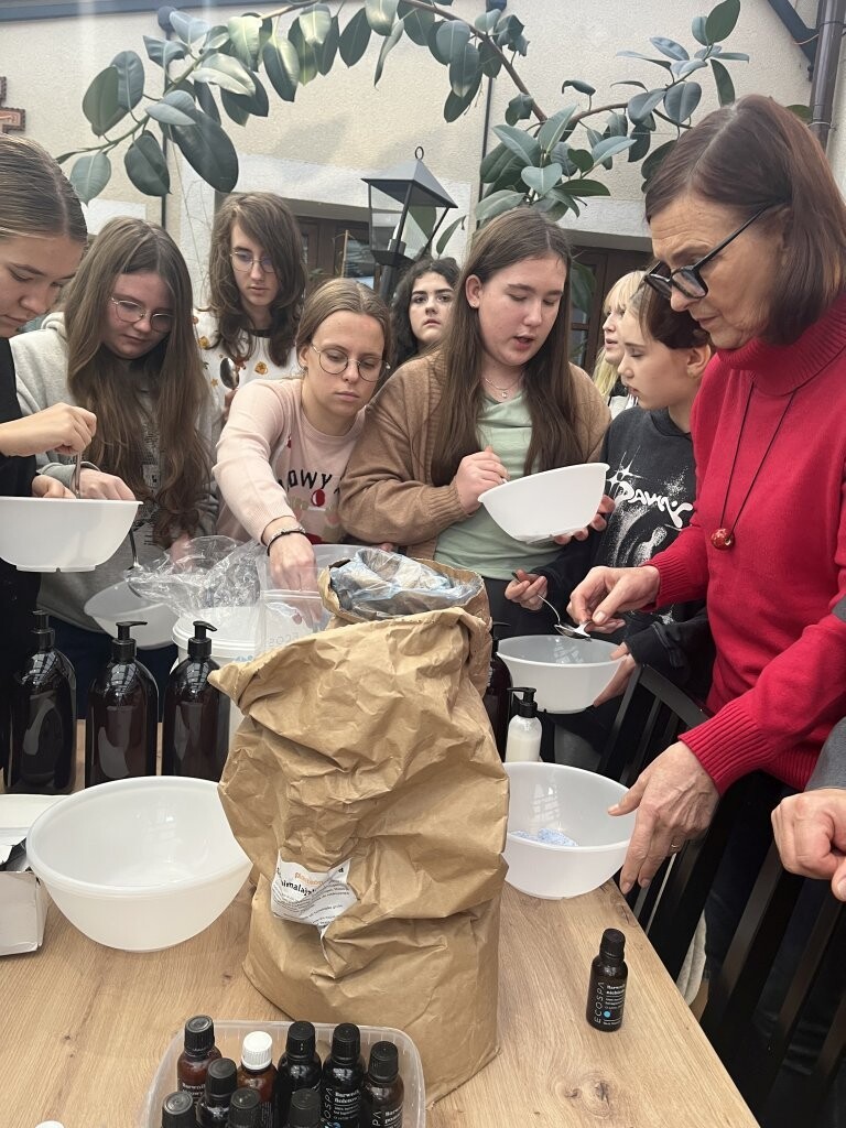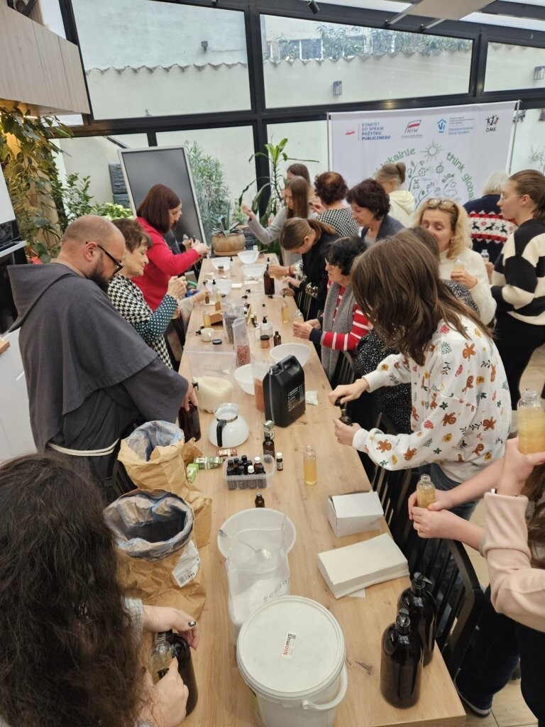 W czwartek – 5 grudnia br. uczennice klasy 7b i nauczycielki naszej szkoły uczestniczyły w warsztatach międzypokoleniowych pod hasłem: „Jakość życia i przyszłość pokoleń w nowej epoce - czyli zrównoważeni w myśleniu i działaniu”. Projekt został przygotowany przez Dom Pojednania i Spotkań w Gdańsku. Celem projektu było umocnienie więzi pokoleniowych, budowanie poczucia tożsamości osobistej i współpraca młodzieży z seniorami. Podczas warsztatów uczniowie współpracowali z seniorami wykonując środki czystości i kosmetyki z naturalnych materiałów. Warsztaty poprowadził o.Tomasz. Bardzo dziękujemy! Było przepięknie, miło, zdobyliśmy wiele cennych informacji na temat eko kosmetyków i ziół. Na zakończenie naszych warsztatów wybraliśmy się na Jarmark Bożonarodzeniowy w Gdańsku.