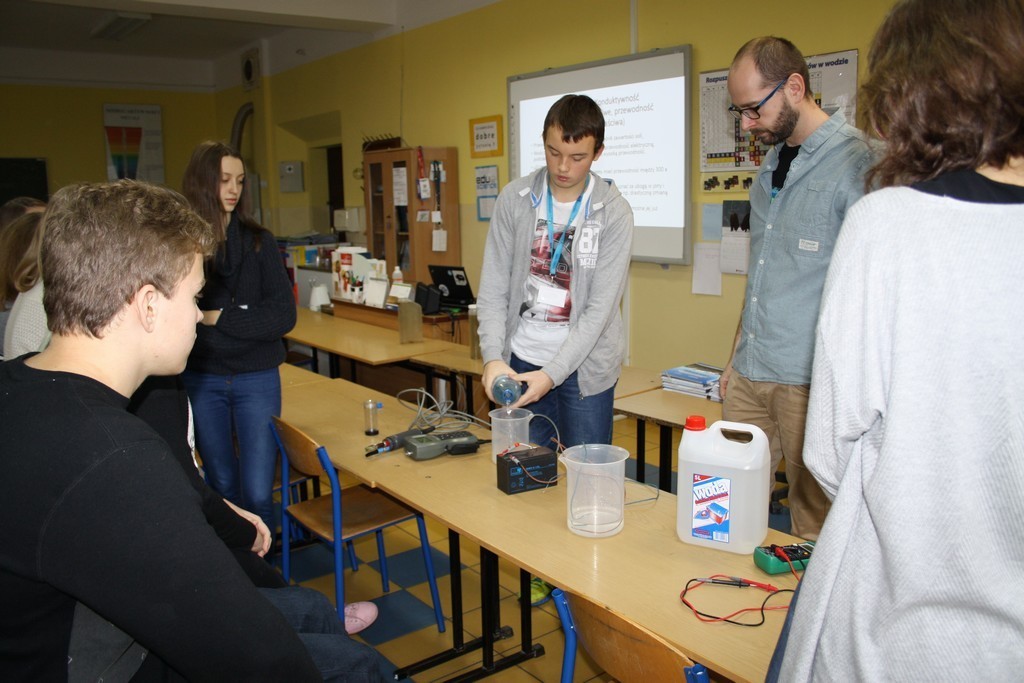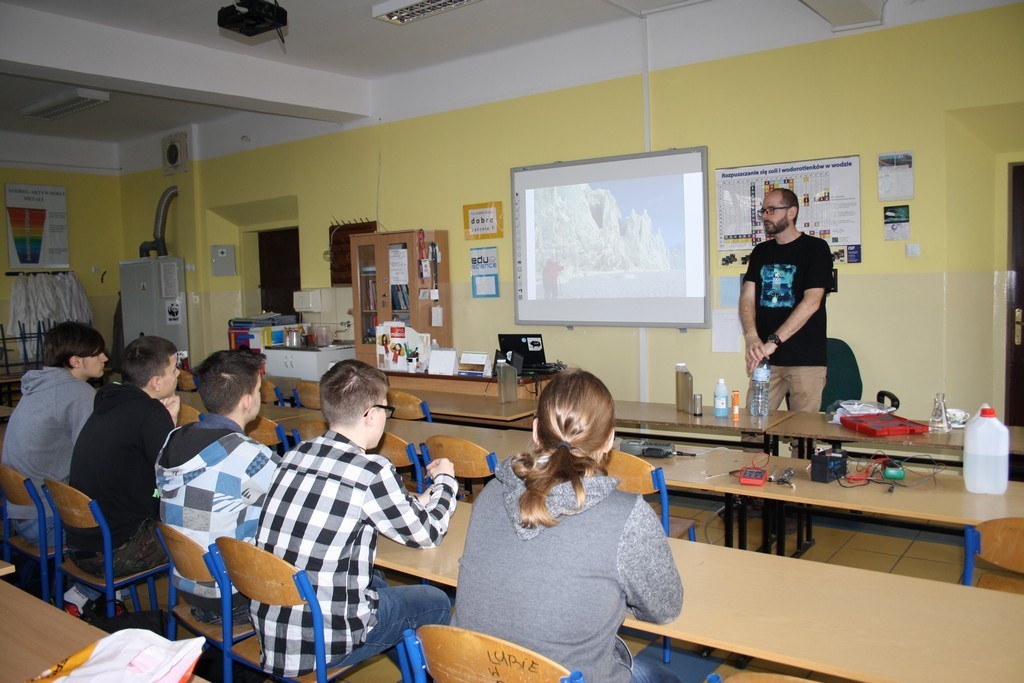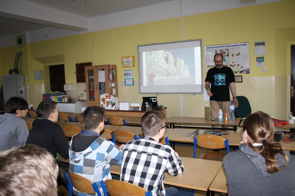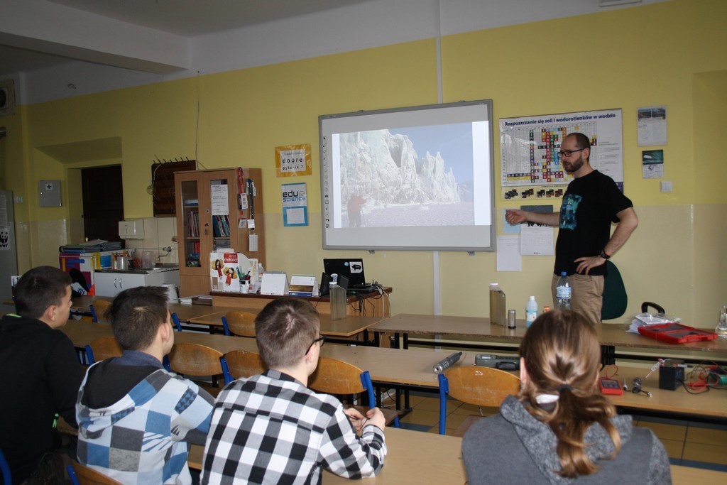 Zajęcia warsztatowe dotyczyły hydrochemii. Pan Adam Nawrot na co dzień realizuje projekty związane z wyspą SVALBARD. Opisy warunków atmosferycznych oraz krajobrazu tego miejsca sprawiły, że po raz kolejny gimnazjaliści przenieśli się z ławek do krainy zasypanej śniegiem.
