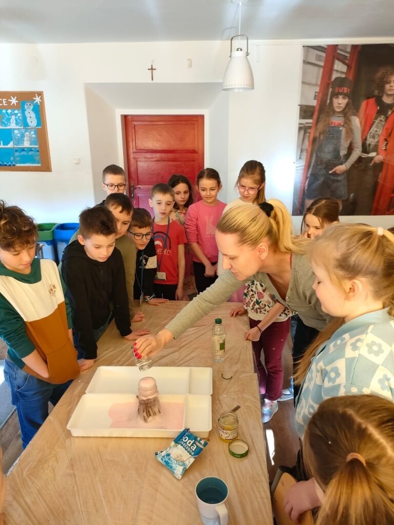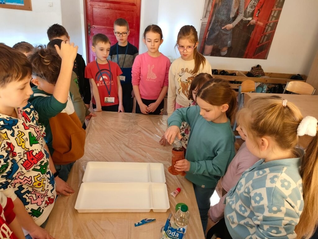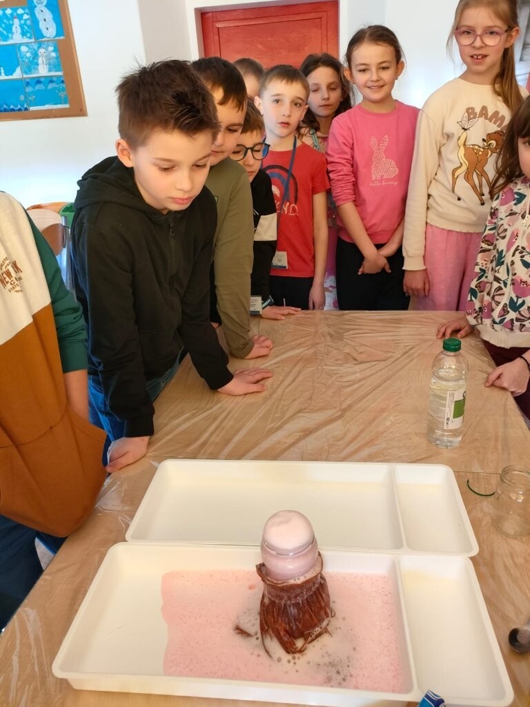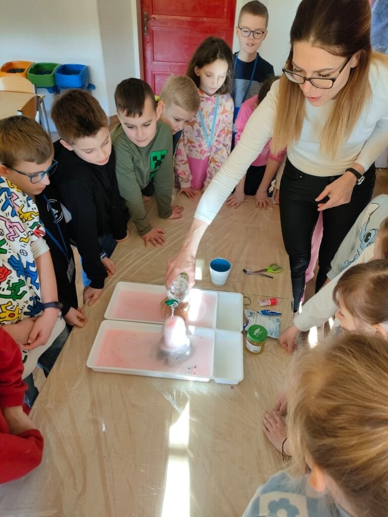 W środę, 6 marca, dzieci uczęszczające do szkolnej świetlicy uczestniczyły w zajęciach poświęconych tematyce wulkanów. Dowiedziały się jak powstają te wyjątkowe wytwory natury oraz, że to rodzaj gór z których podczas erupcji może wydobywać się ognista lawa. Wszyscy mogli wziąć udział w eksperymencie wybuchu wulkanu. Tego typu eksperyment można wykonać również w domu - oczywiście w obecności osób dorosłych. Potrzebne są jedynie: ocet, soda oczyszczona, woda, odrobina płynu do naczyń i ewentualnie czerwona farbka. Efekt "wow" gwarantowany!