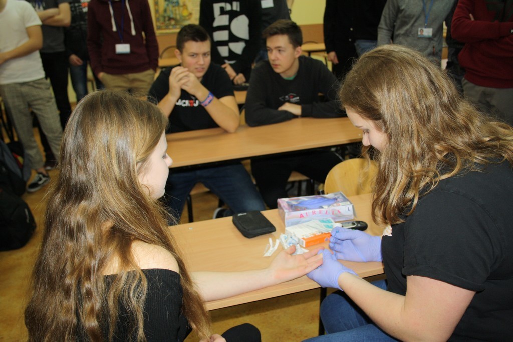 17 stycznia br. uczniowie naszej szkoły uczestniczyli w zajęciach przeprowadzonych przez swoich starszych kolegów z I Liceum Ogólnokształcącego im. Stefana Żeromskiego w Lęborku realizujących projekt pod hasłem: (nie)Zwolnieni z Cukrzycy. Jego celem jest uświadamianie społeczeństwa o coraz większej liczbie zachorowań na cukrzycę oraz promowanie zdrowego stylu życia. Zajęcia uświadomiły naszym uczniom jak groźna chorobą jest cukrzyca, jak wygląda jej leczenie oraz na co powinno się zwrócić szczególną uwagę. Licealiści zaprezentowali również działanie glukometru oraz prezentację podsumowującą najważniejsze wiadomości dotyczące tej tematyki. Na zakończenie młodzież wypełniła ankietę sprawdzającą zdobytą przez nich wiedzę.