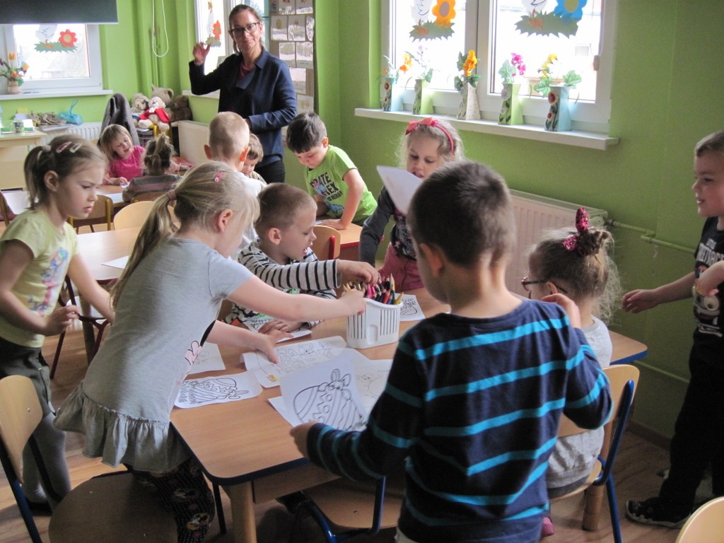 W minioną środę nasze uczennice z kl. Ie i p. A. Dudojć ponownie odwiedziły zaprzyjaźnione przedszkolaki z grupy ,, Słoneczek”. Tematem spotkania była Wielkanoc oraz związane z tym świętem przygotowania. Tym razem dzieci wysłuchały wierszy, historii i opowiadania o kolorowych jajkach, czyli pisankach.