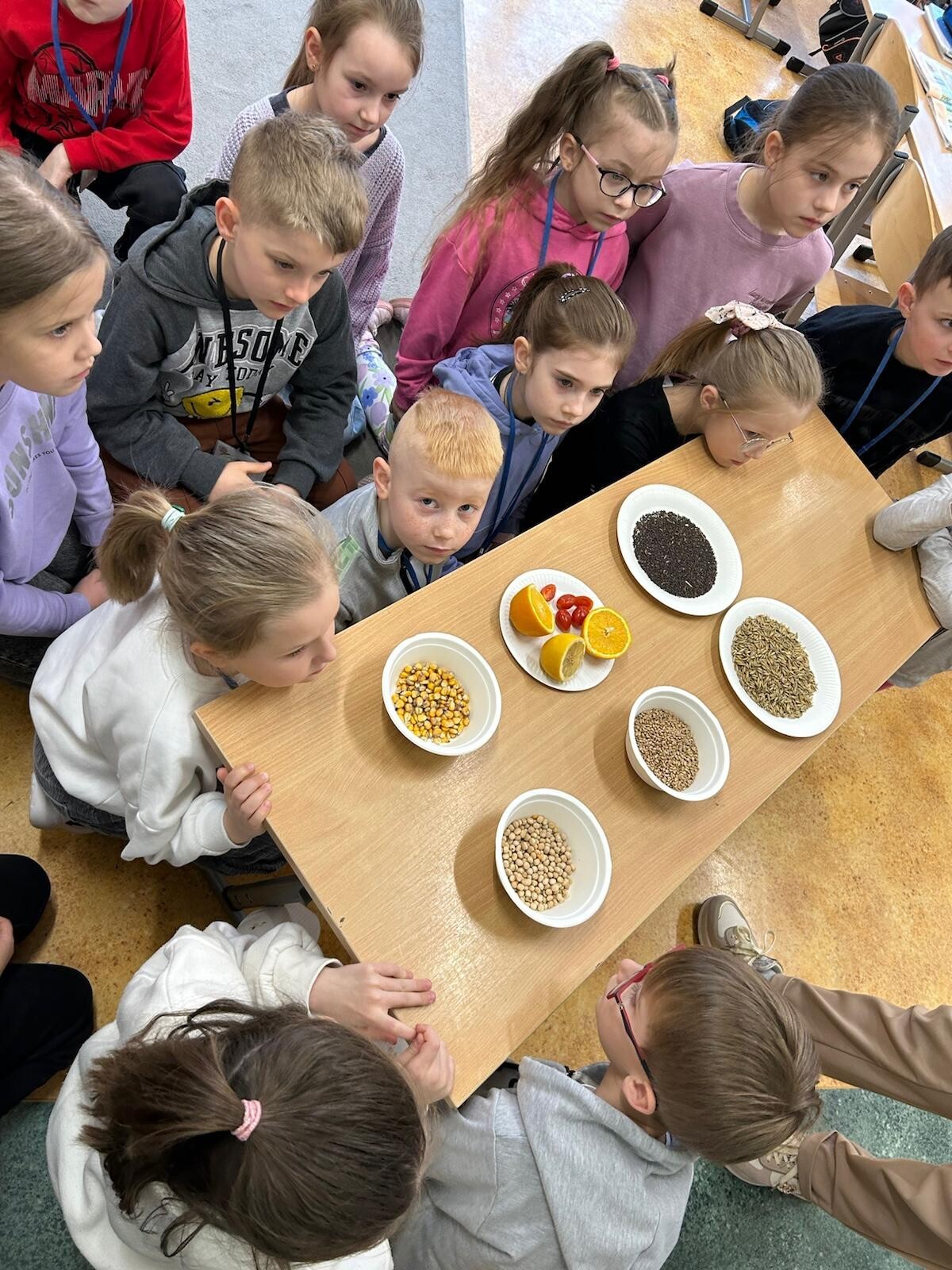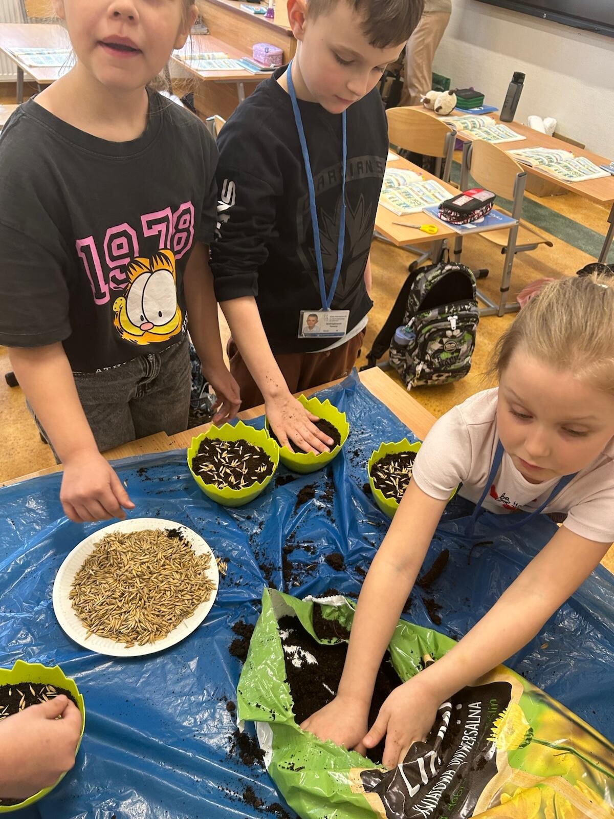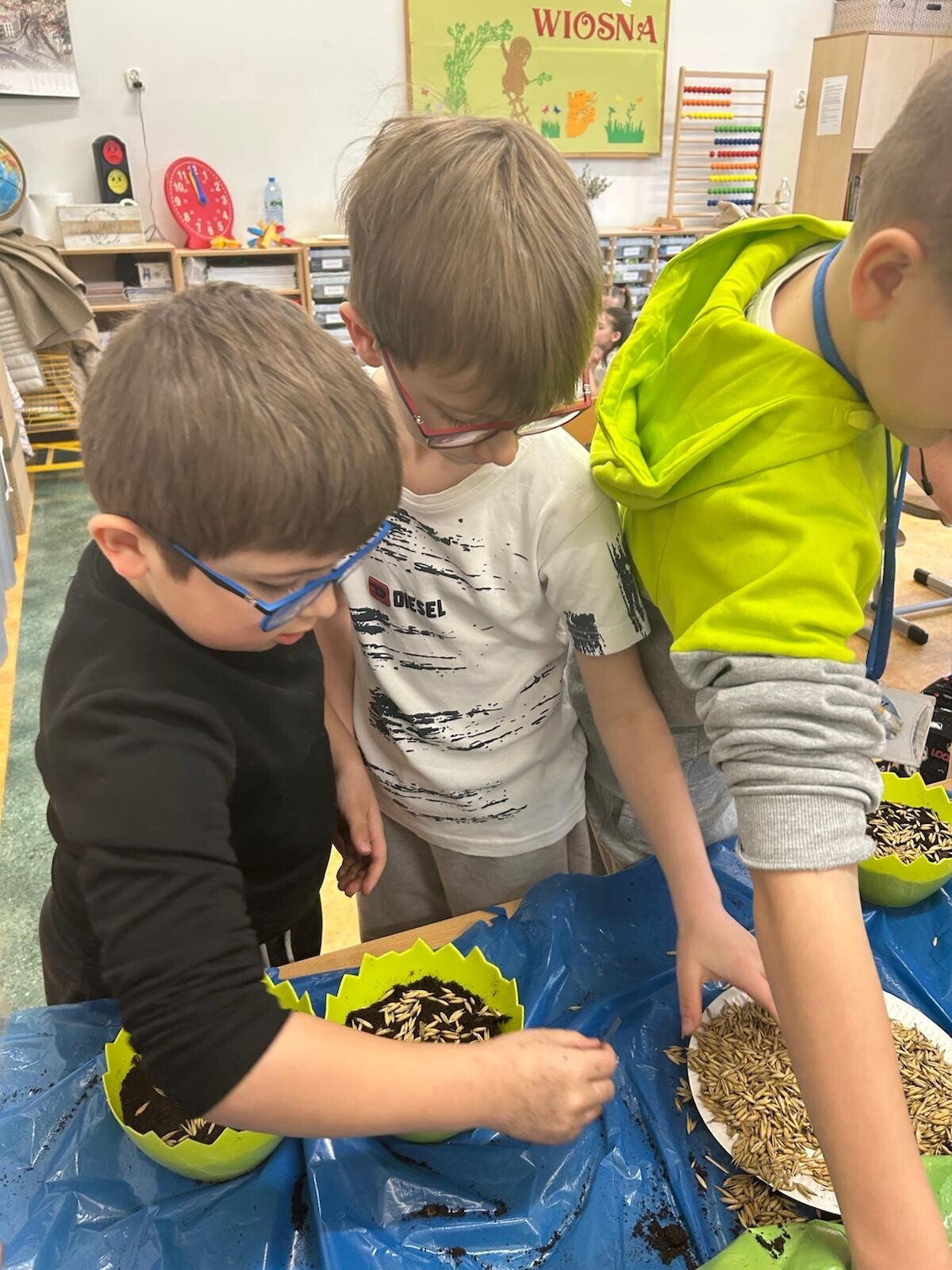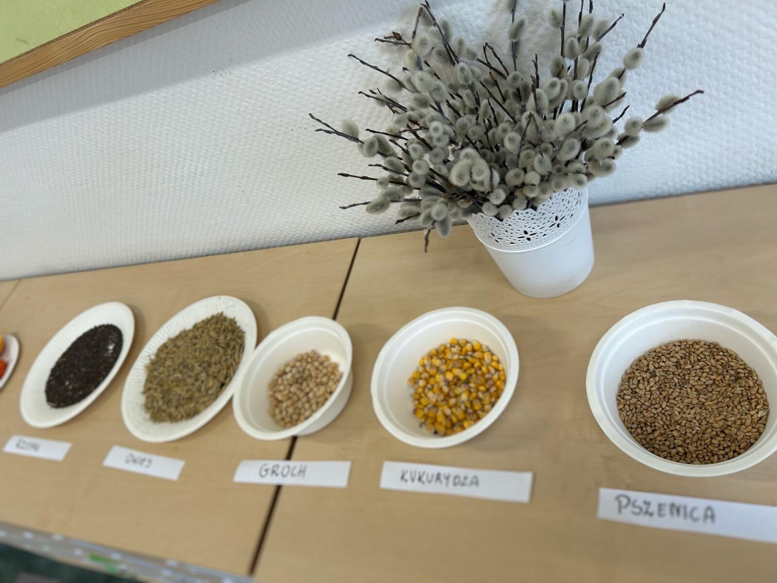 Dziś, podczas edukacji przyrodniczej, uczniowie klasy 1 c poznawali rodzaje ziaren zbóż, a także etapy wzrostu roślin. Przy okazji zasiali owies, którym przyozdobią świąteczne stoły.