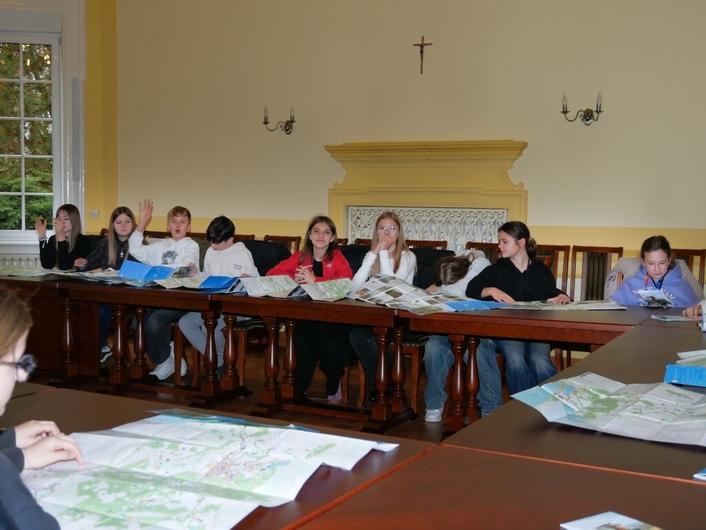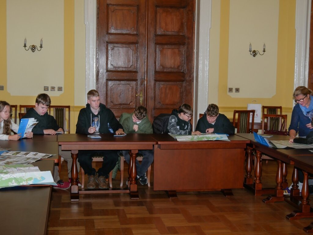 Wraz z pracownikiem wydziału edukacji i spraw społecznych oraz towarzyszącą mu stażystką uczniowie zostali zapoznani i oprowadzeni po ważnych miejscach urzędu. Mogli przeanalizować mapę naszego powiatu, należące do niego gminy, a w sali 13 obejrzeć ich herby, które zaprezentowane są w formie witraży. Wizyta przebiegła w milej atmosferze. Uczniowie zostali zaproszeni na kolejną wizytę, gdy będą wybierać szkoły ponadpodstawowe.