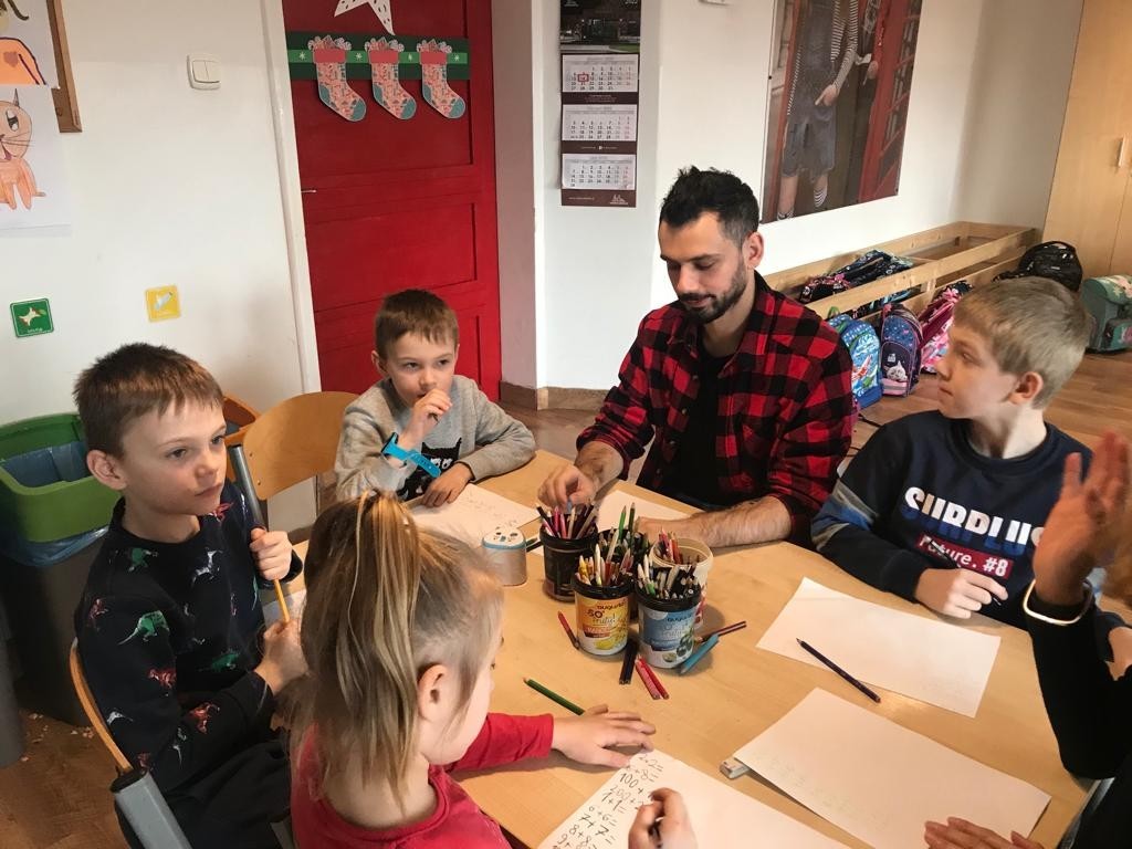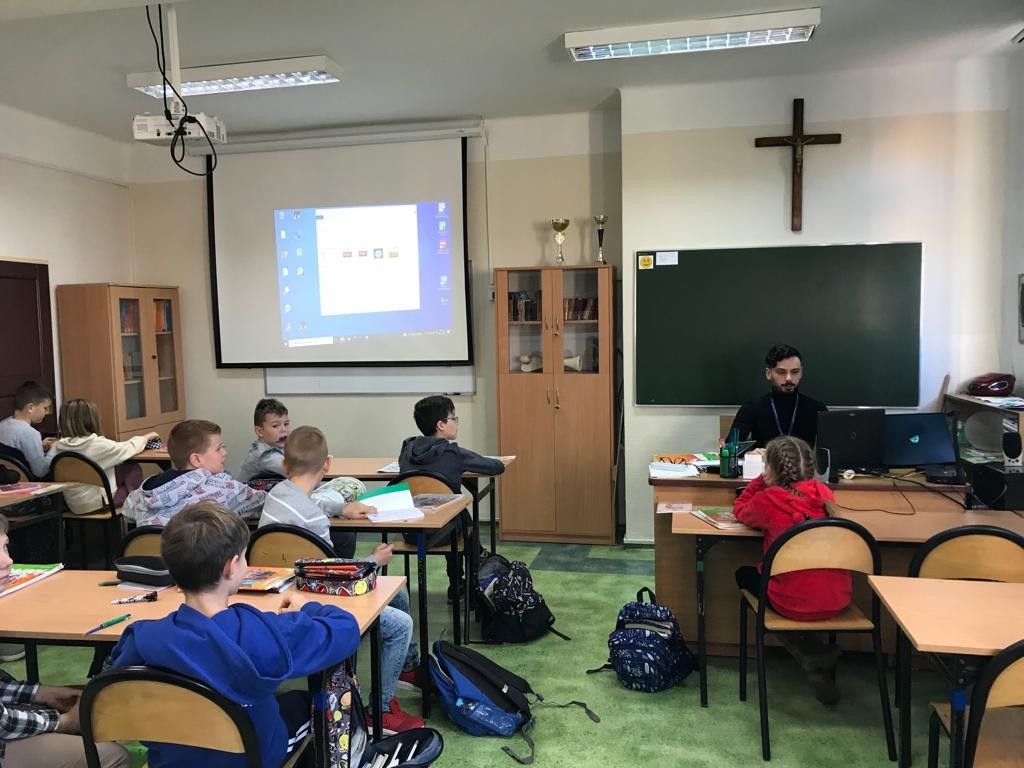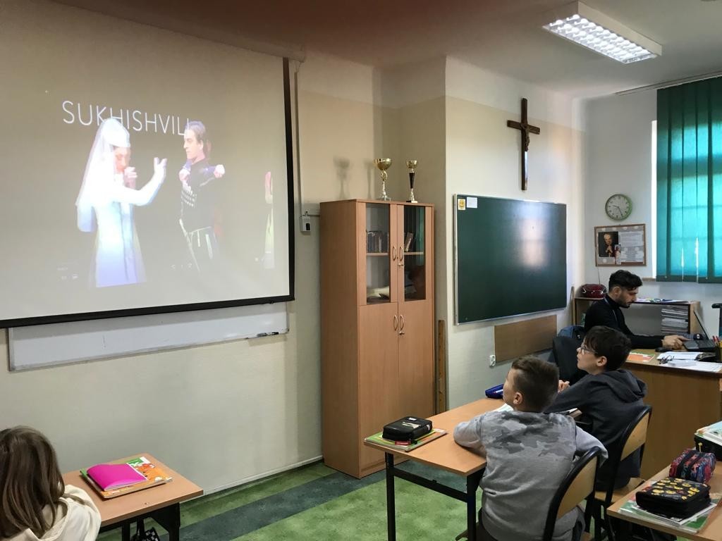 Od końca października gościmy w naszej szkole wolontariuszy z Gruzji. Klasa IVc miała możliwość porozmawiania w języku angielskim z jednym z gości i obejrzenia prezentacji przybliżającej najważniejsze i najbardziej znane miejsca w Gruzji. Podczas swoich wizyt wolontariusze najwięcej czasu spędzają w świetlicy szkolnej, aktywnie uczestnicząc w codziennych zajęciach świetlicowych.