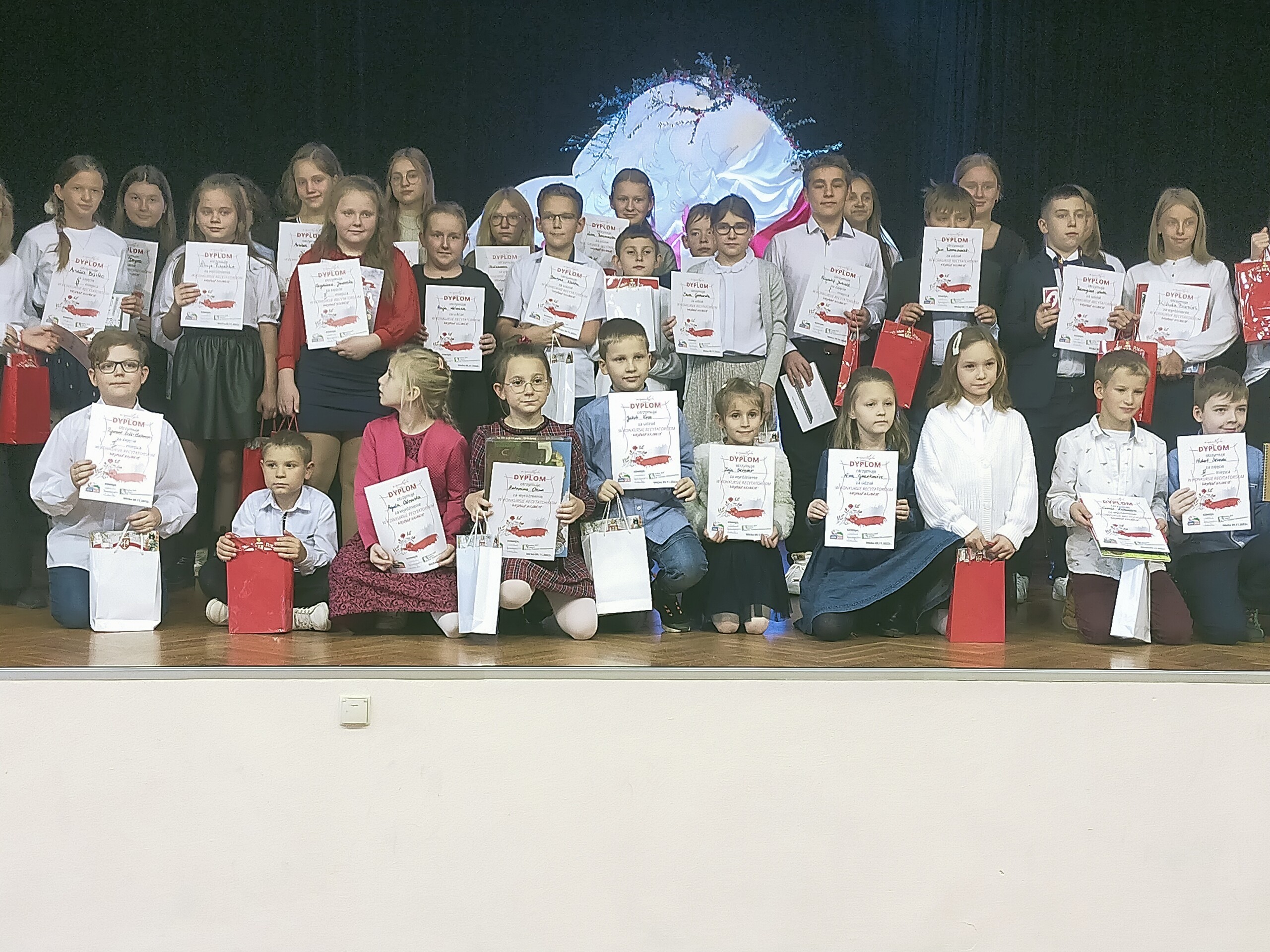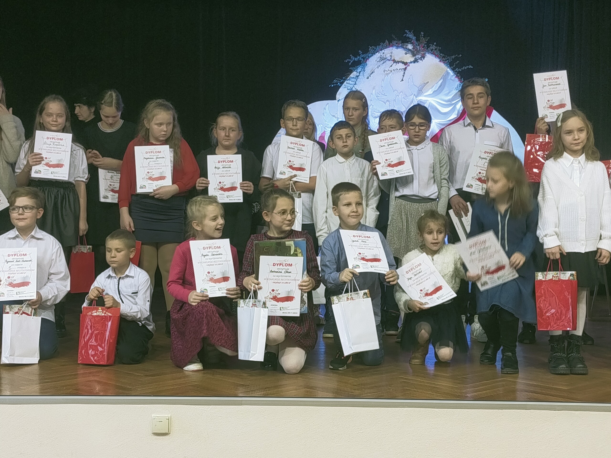 Dnia 9 listopada w Gminnym Ośrodku Kultury i Sportu w Wicku, w przepięknej patriotycznej scenerii odbył się Powiatowy Konkurs Recytatorski Wojenne Historie. Konkurs przeznaczony był dla uczniów szkół podstawowych , a jego celem było rozwijanie wrażliwości dzieci i młodzieży na słowo poetyckie oraz zaszczepienie miłości do ojczyzny. Uczestnicy rywalizowali w dwóch kategoriach: klasy I- III oraz IV- VIII. Naszą szkołę reprezentowało 10 uczniów z klas: Va, VIa i VIIIa. Wszyscy zaprezentowali się wspaniale, każdy z uczestników musiał zadeklamować wiersz oraz fragment prozy o tematyce wojennej. Każdy z uczestników konkursu otrzymał pamiątkowy dyplom oraz nagrodę. Miło nam poinformować , że cztery uczennice zostały szczególnie docenione przez jury :