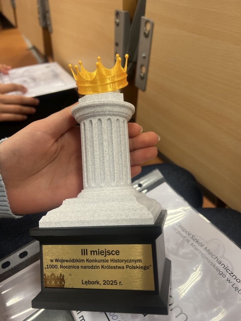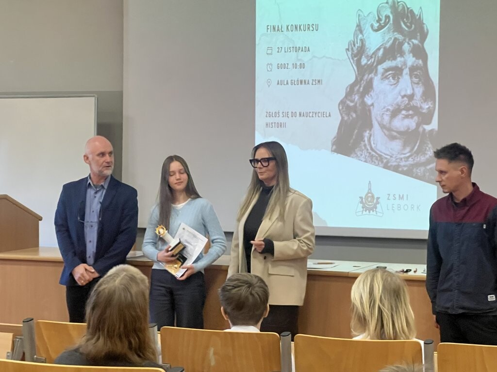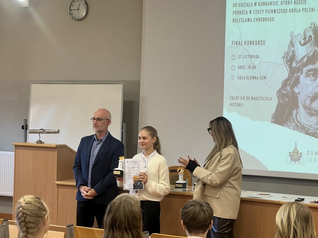 Zespół Szkół Mechaniczno-Informatycznych w Lęborku zaprosił uczniów z województwa pomorskiego do udziału w konkursie historycznym z okazji 1000-lecia państwa polskiego. Naszą szkołę reprezentowały Anna Dybowska z klasy VIIIa i Nikola Tulikowska z VIIc. Dziewczęta świetnie wypadły w konkursie popisując się wiedzą na temat dynastii Piastów. Ostatecznie Ania zajęła II miejsce, zaś Nikola III. Gratulujemy, wielka to dla nas radość!