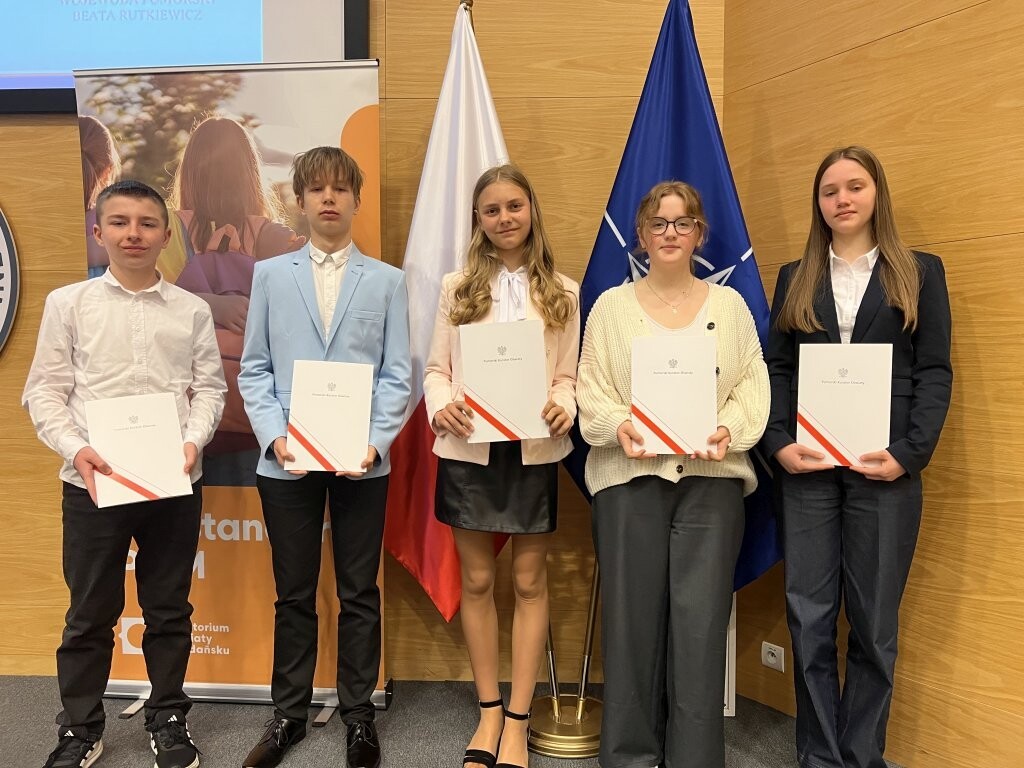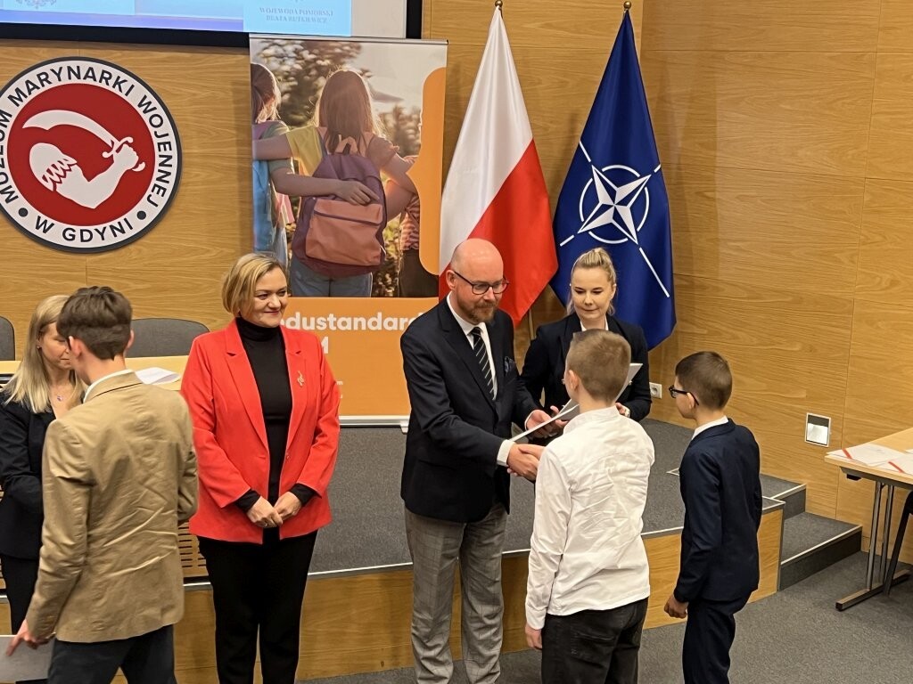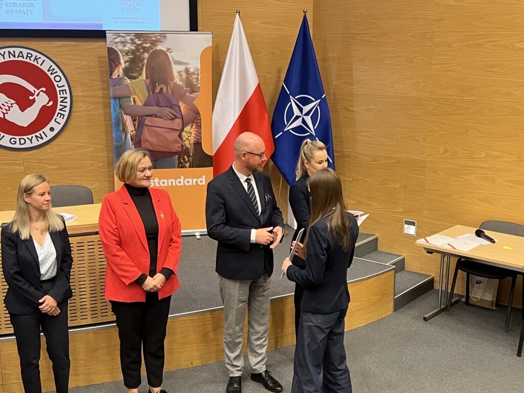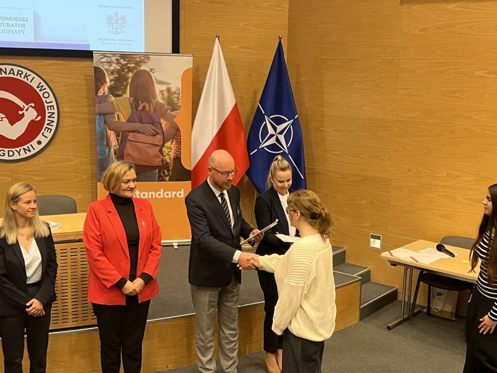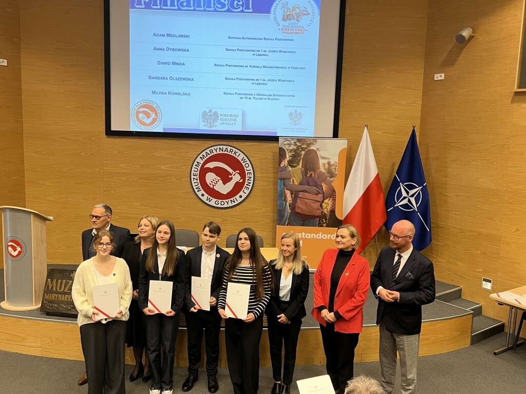 8 maja w Muzeum Marynarki Wojennej w Gdyni odbyła się uroczysta gala wręczenia zaświadczeń laureatom i finalistom konkursu: "Losy żołnierza i dzieje oręża polskiego". Wśród zaproszonych gości znaleźli się p. Grzegorz Kryger - Pomorski Kurator Oświaty, wicewojewoda pomorska p. Anna Olkowska-Jacyno, wiceprezydent Gdyni p. Oktawia Gorzeńska i starszy wizytator p. Rafał Skrzypiński. Uroczystość zainaugurował wykład historyczny zastępcy dyrektora Muzeum Marynarki Wojennej w Gdyni, dotyczący represji wobec dawnych członków marynarki wojennej. Uczniowie odebrali zasłużone zaświadczenia i zwiedzili muzeum. Tytuł Laureata zdobyli: Nikola Tulikowska (VIc), Tymoteusz Jelonek (VIIIb). Tytuł Finalisty: Anna Dybowska (VIIa), Marcel Rzoska (VIa) i Barbara Olszewska (VIIIb). Miło nam zakomunikować, że Nikola i Tymoteusz zakwalifikowali się do etapu centralnego w Warszawie, który odbędzie się w czerwcu. Uczniów przygotowywały: Anna Zdończyk-Knura i Marzena Kurzydło.