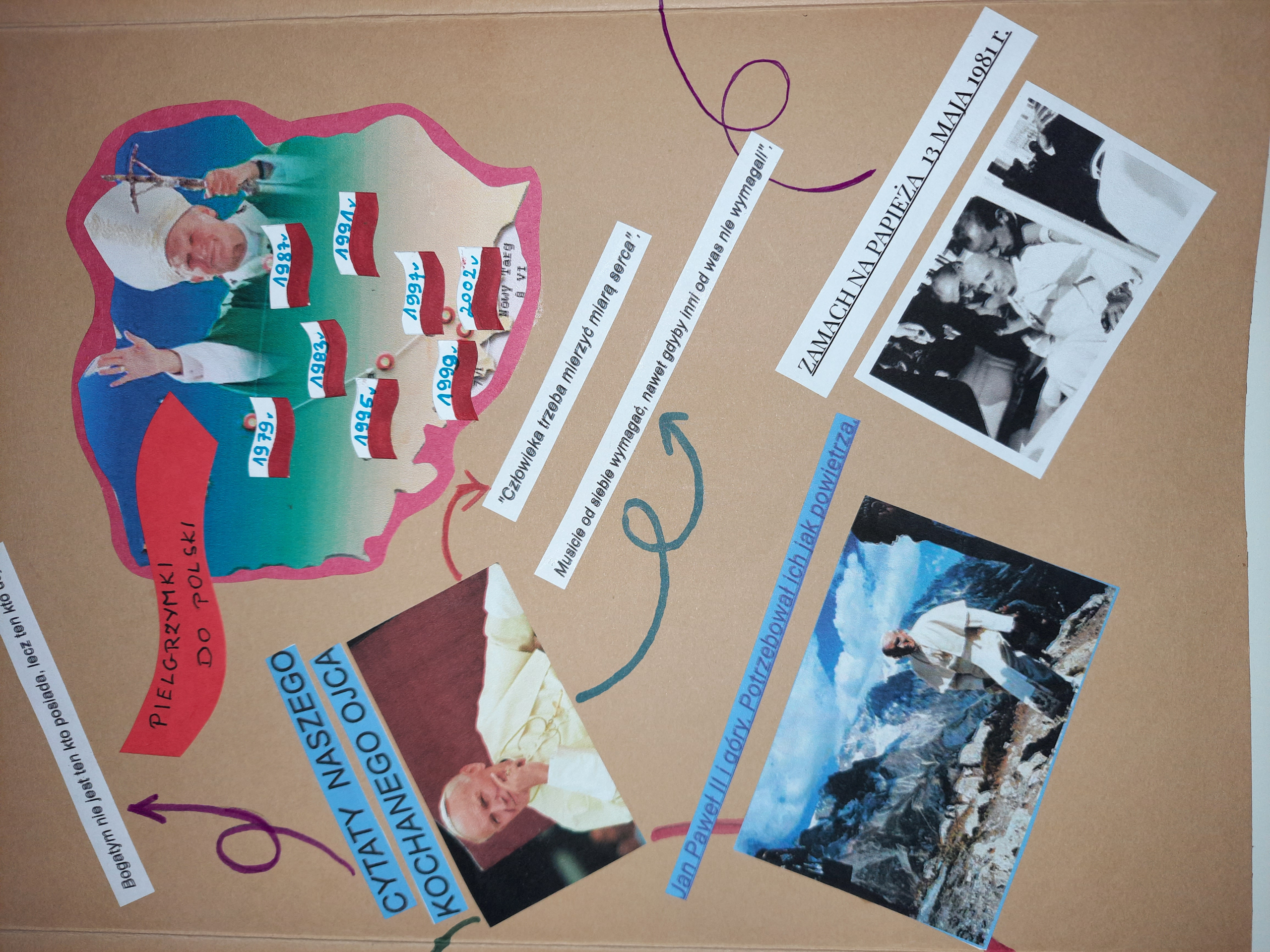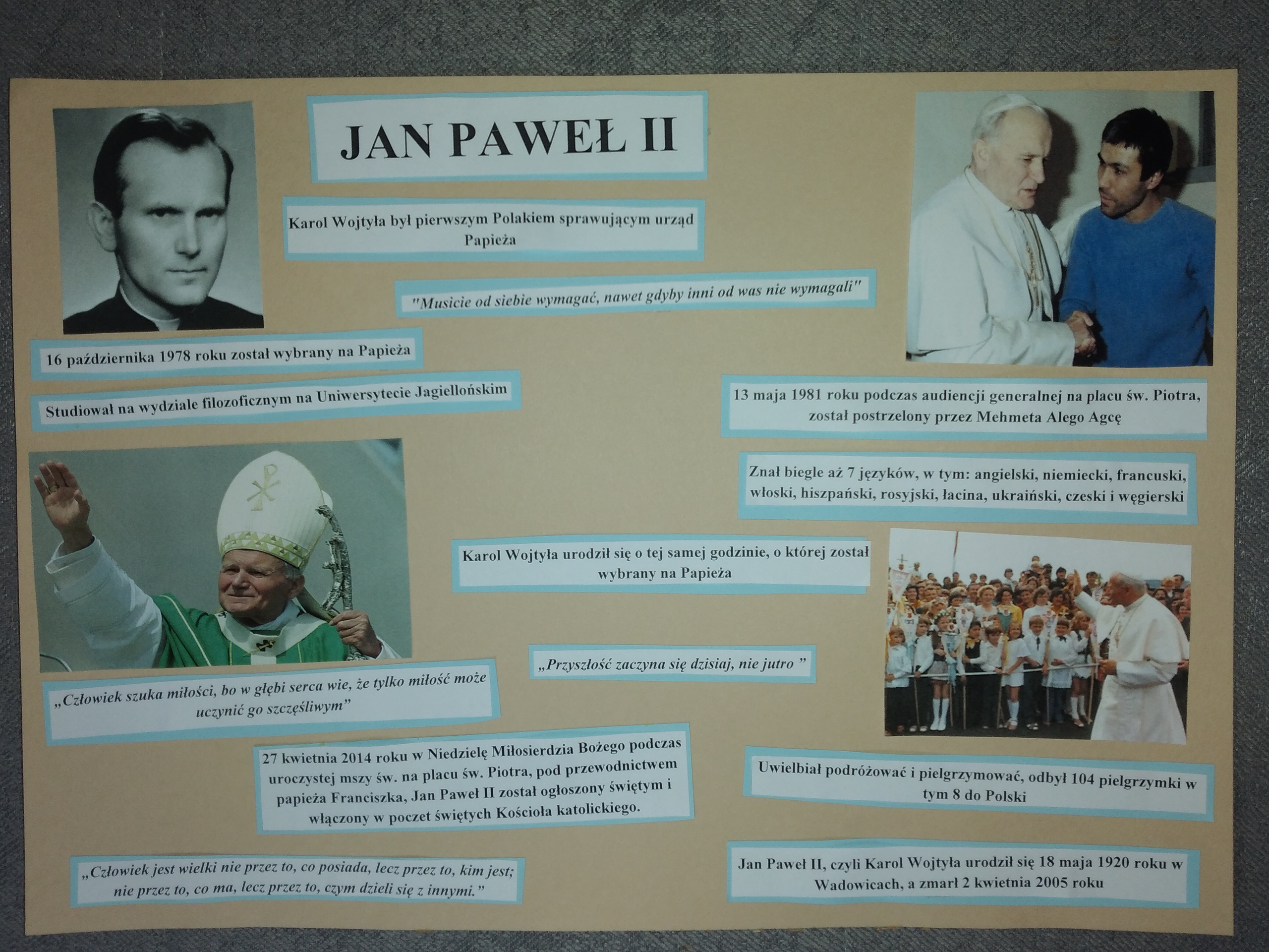 To już 16 lat upłynęło od śmierci świętego Jana Pawła II. W tym roku, 18 maja przypadałaby 101 rocznica jego urodzin. 13 maja wspominaliśmy zamach na Placu Świętego Piotra w Rzymie na życie papieża Polaka. Uczniowie klas czwartych, poznając sylwetki sławnych Polaków, poświęcili czas na przygotowanie prezentacji, lapbooków i plakatów poświęconych Ojcu Św. Dziedzictwo Karola Wojtyły jest tak duże, że trudno je zmieścić w pigułce. Nasi uczniowie w warunkach pracy zdalnej wykonali ciekawe prace.