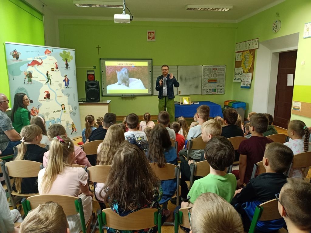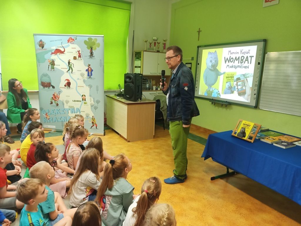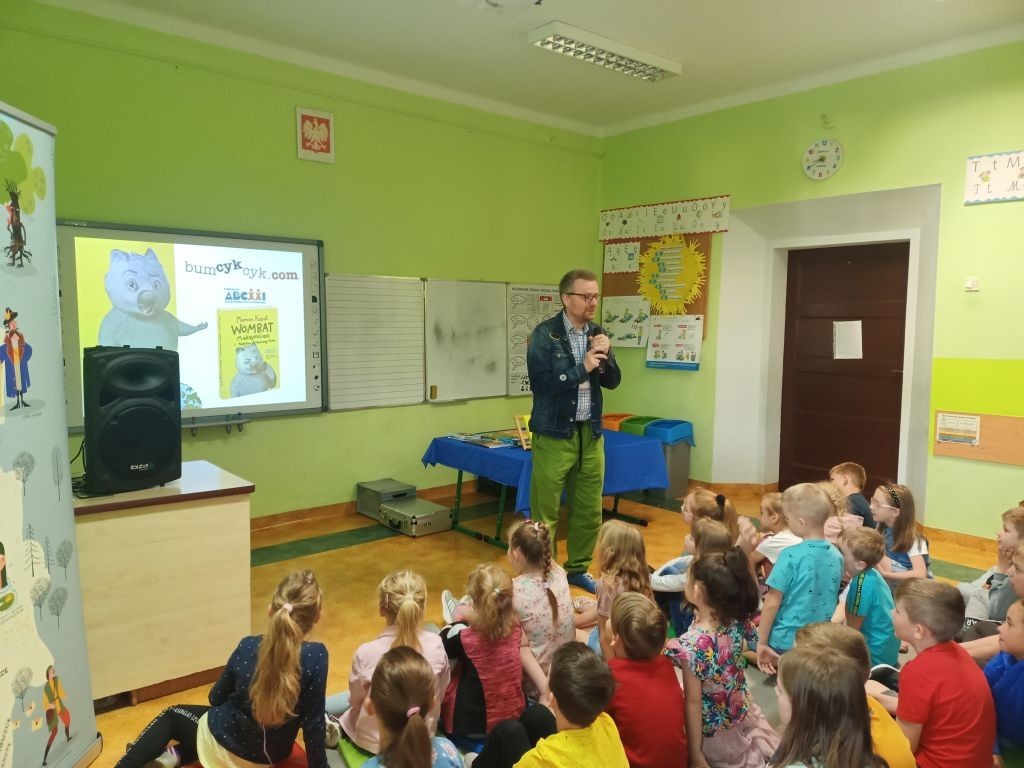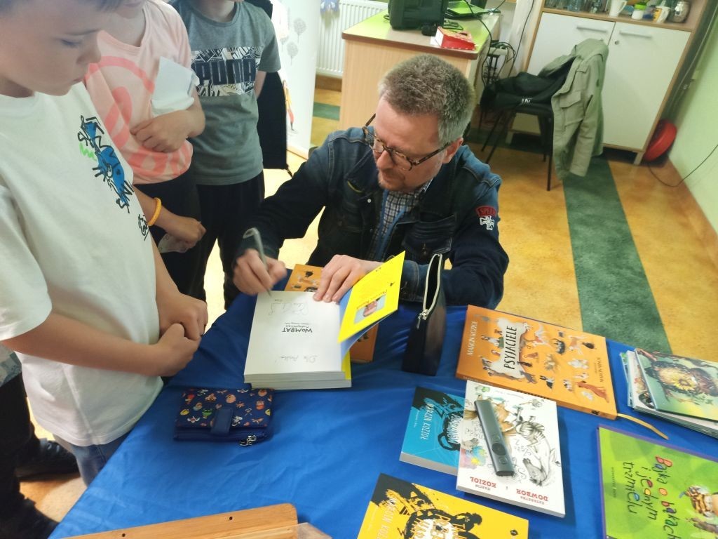 W miniony poniedziałek uczniowie klas: Ib, IIa i IIc uczestniczyli w spotkaniu autorskim z panem Marcinem Koziołem. Pan Marcin pisze książki dla dzieci i młodzieży, jest autorem lektury szkolnej – „Skrzynia Władcy Piorunów”. To zapalony podróżnik, który zwiedził ponad 60 krajów. Owocem jego podróżniczej pasji jest seria książek o Wombacie Maksymilianie i to właśnie o tym sympatycznym zwierzaku nasz gość opowiedział uczniom na spotkaniu. Po interesującym wykładzie można było nabyć książki autora z pamiątkowym autografem.