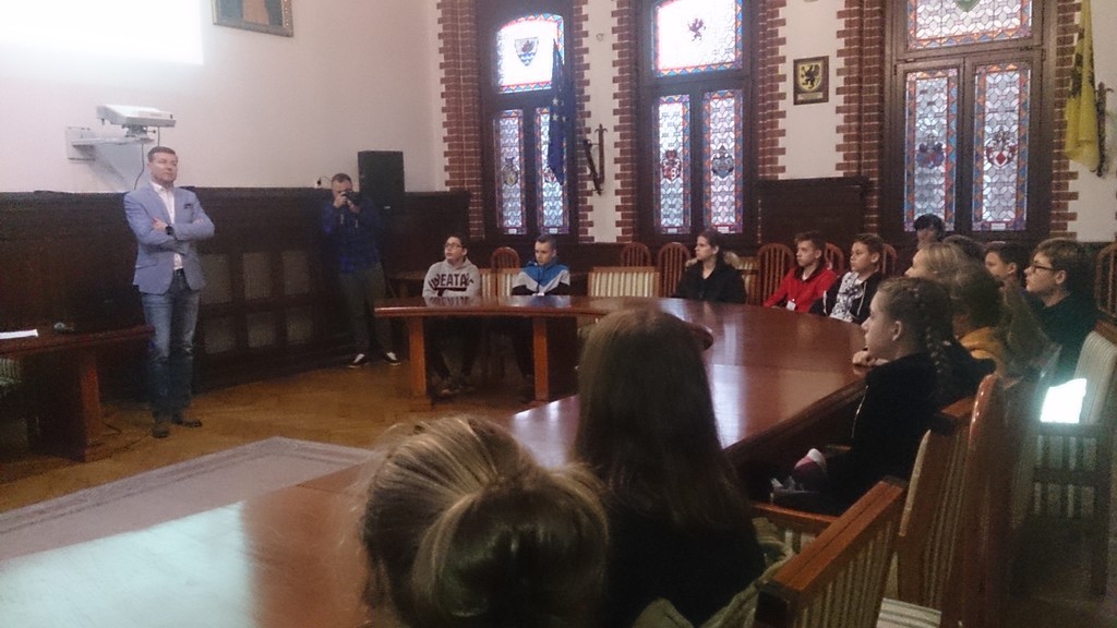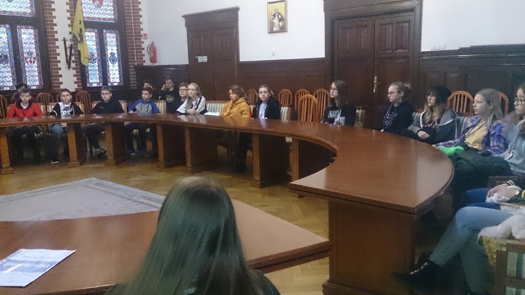 21.11.2019 klasa VIIIc odwiedziła Urząd Miejski w Lęborku. W Ratuszu uczniów powitał Burmistrz pan Witold Namyślak. Następnie zaprowadził ich do skarbca i opowiedział o jego historii. Kolejnym punktem wizyty było zwiedzenie Sali Rajców, w której przybyłych przyjął Sekretarz Miasta - pan Marian Kurzydło. Wszyscy mogli zasiąść przy okrągłym stole, tak jak czynią to lęborscy radni podczas swoich spotkań. Uczniowie dowiedzieli się, na czym polega praca w urzędzie , jakie kwalifikacje trzeba mieć, aby móc podjąć pracę w Ratuszu . Pan Sekretarz opowiadał też o historii Ratusza , o pięknej Sali Rajców, jej wystroju i przeznaczeniu. Młodzież mogła również zadawać pytania dotyczące pracy w urzędzie oraz spraw, które można w nim załatwić. Atmosfera spotkania była bardzo miła i sympatyczna .