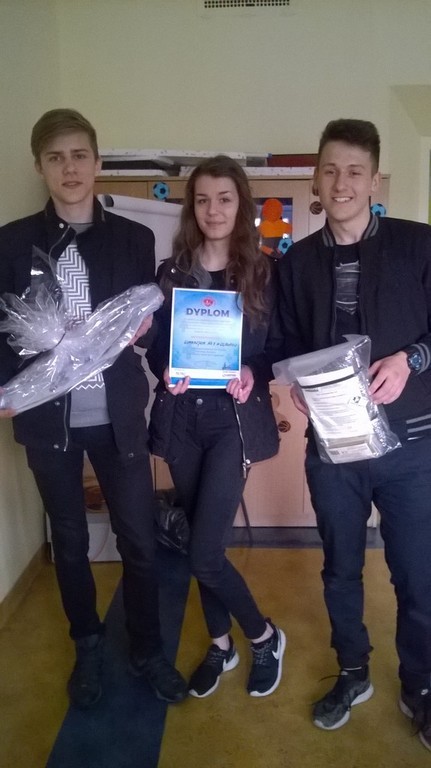Naszą szkołę reprezentowali uczniowie klas trzecich – Magda Ciszek i Kacper Wiloch z klasy IIIb oraz Przemek Sawoniuk z IIIc. Efektem ich działań było wyróżnienie oraz drobne nagrody rzeczowe.