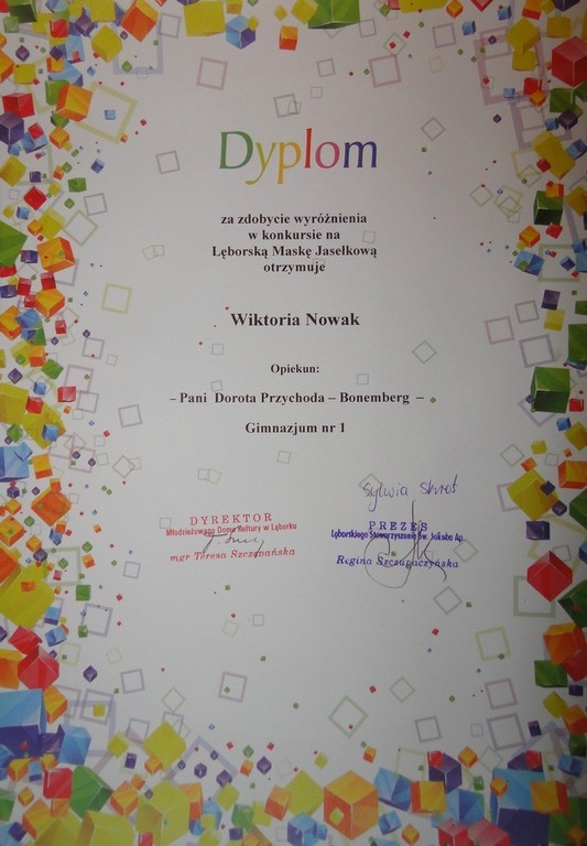 Podczas przeglądu podsumowany został konkurs plastyczny na Lęborską Maskę Jasełkową „ZOSTAŃ GWIAZDĄ JEZUSA”. Wyróżnienie w konkursie otrzymała nasza gimnazjalistka – Wiktoria Nowak z klasy IIIa.