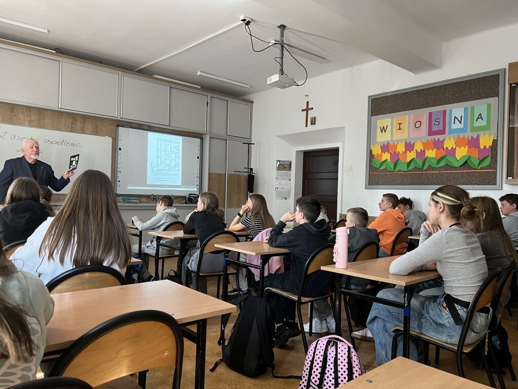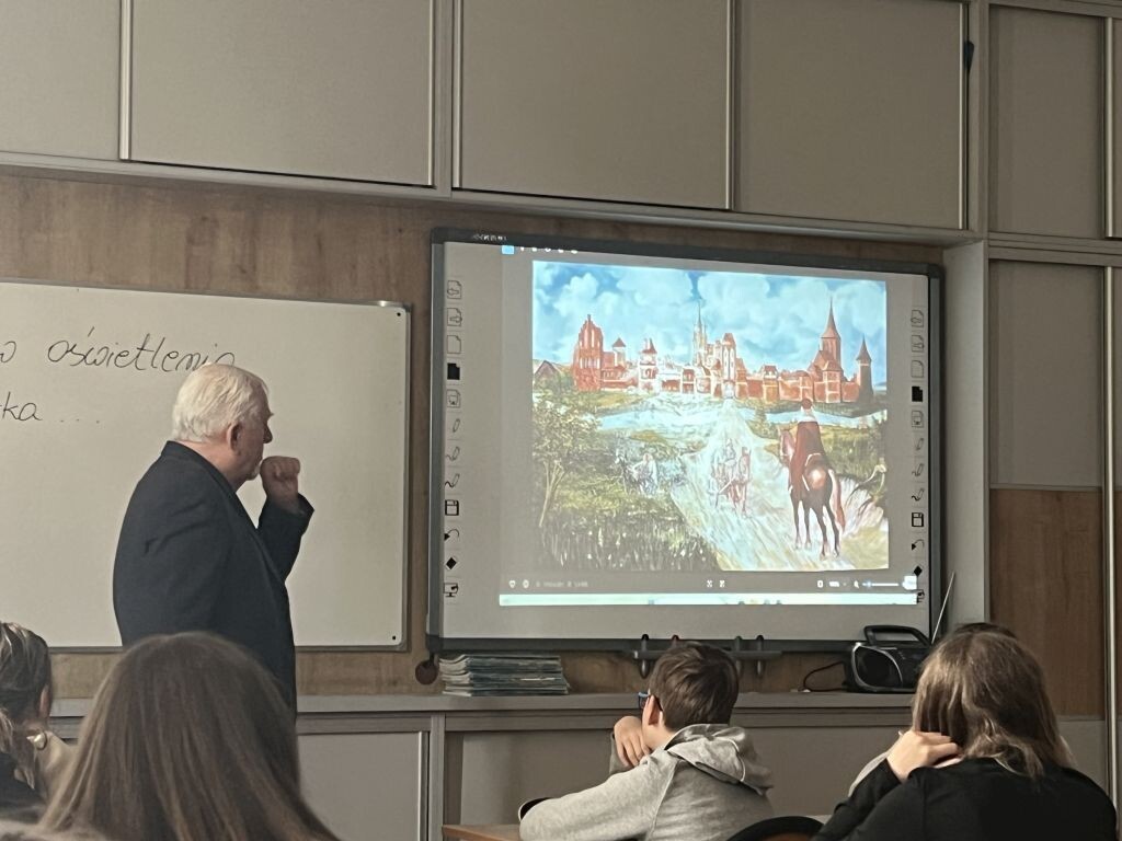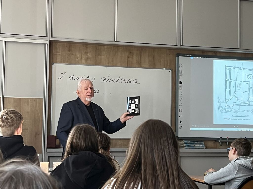W ciekawym spotkaniu z pasjonatem historii uczestniczyli uczniowie klasy VIa. Nasze zaproszenie przyjął pan Maurycy Frąckowiak, który przeniósł nas do średniowiecznego Lęborka. Prelegent opowiadał o ciekawym położeniu miasta. Głównym tematem była jednak kwestia oświetlenia na przestrzeni dziejów: kaganki, lampy olejowe i naftowe, gazowe oraz kandelabry zostały odnalezione na dawnych fotografiach Lęborka. Mnóstwo ciekawostek i ogromna wiedza dotycząca dziejów naszego miasta, pozwoliły nam poznać wiele interesujących historii o naszej małej Ojczyźnie.