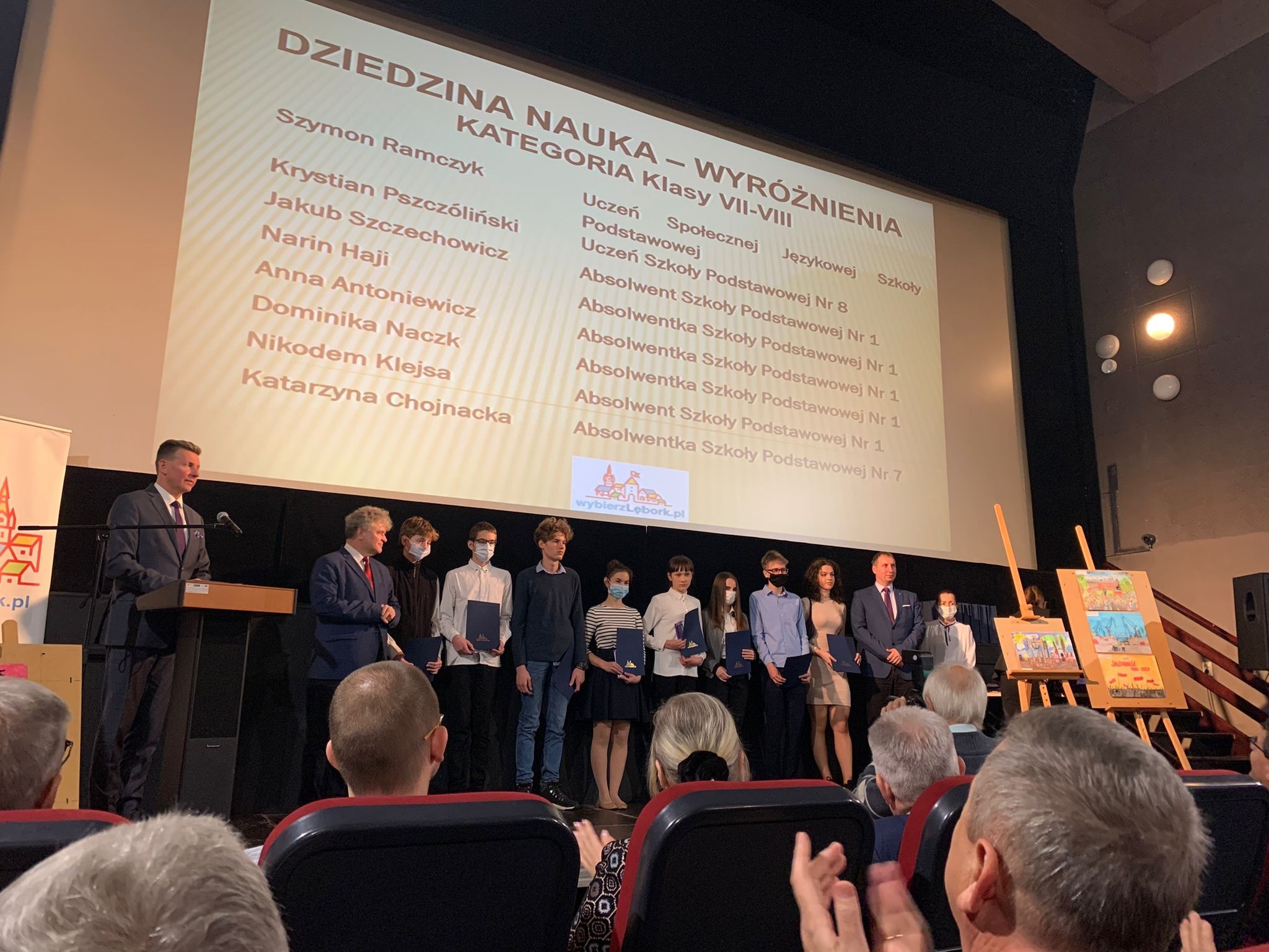 Miejskie obchody Dnia Edukacji Narodowej zorganizowano w tym roku w lęborskim kinie Fregata. Na uroczystość przybyli uczniowie, nauczyciele i dyrektorzy szkół wyróżnieni za osiągnięcia w roku szkolnym 2020/2021. Nagrody przyznawane są w kilku grupach wiekowych oraz trzech kategoriach: nauka, kultura i sztuka oraz sport. Miło nam zakomunikować, że wielu nagrodzonych to uczniowie naszej szkoły. Poprzedni rok przyniósł nam wiele sukcesów w konkursach i zawodach. Komisje opiniujące wnioski zauważyły te sukcesy i doceniły je nagrodami finansowymi.