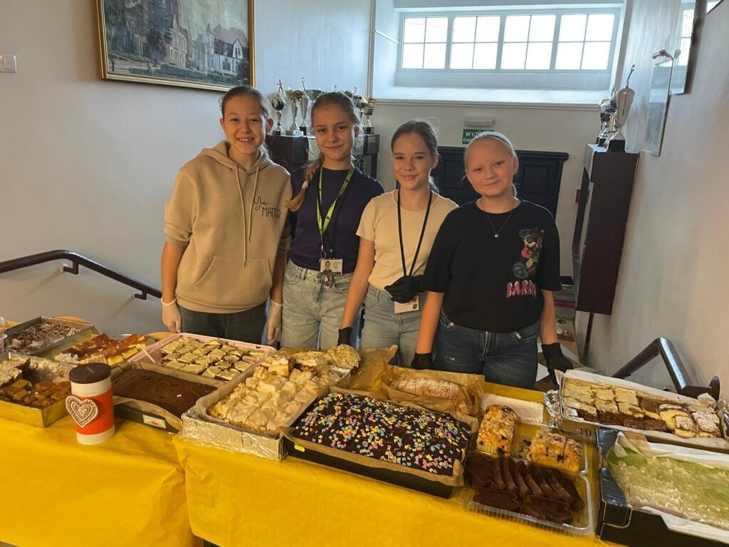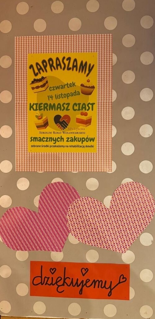 Pod koniec listopada Szkolne Koło Wolontariatu i Samorząd Uczniowski zorganizowały w naszej szkole kiermasz ciast. Dzięki niemu udało się zebrać kwotę 2 tysięcy złotych, która przekazana została na konto Fundacji Dzieciom "Zdążyć z Pomocą" na wsparcie w leczeniu i terapii Amelki Nowińskiej-Raczkowskiej. Bardzo dziękujemy rodzicom, którzy wsparli naszą akcję i przygotowali pyszne ciasta. Miło nam, że zawsze możemy liczyć na Waszą pomoc!