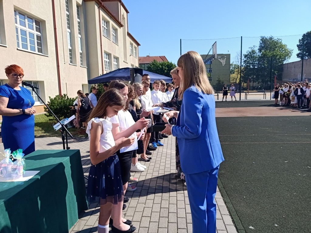 Po części oficjalnej zespoły klasowe udały się do sal lekcyjnych, by tam z rąk wychowawców odebrać świadectwa szkolne oraz nagrody za wysokie wyniki w nauce oraz pozostałe konkursy – plastyczne, tematyczne oraz sportowe. W mijającym roku szkolnym w klasach I-III na 229 uczniów wyróżnienia za bardzo dobre wyniki w nauce otrzymało 142 uczniów, zaś w klasach IV-VIII na 292 uczniów wyróżniono 70.