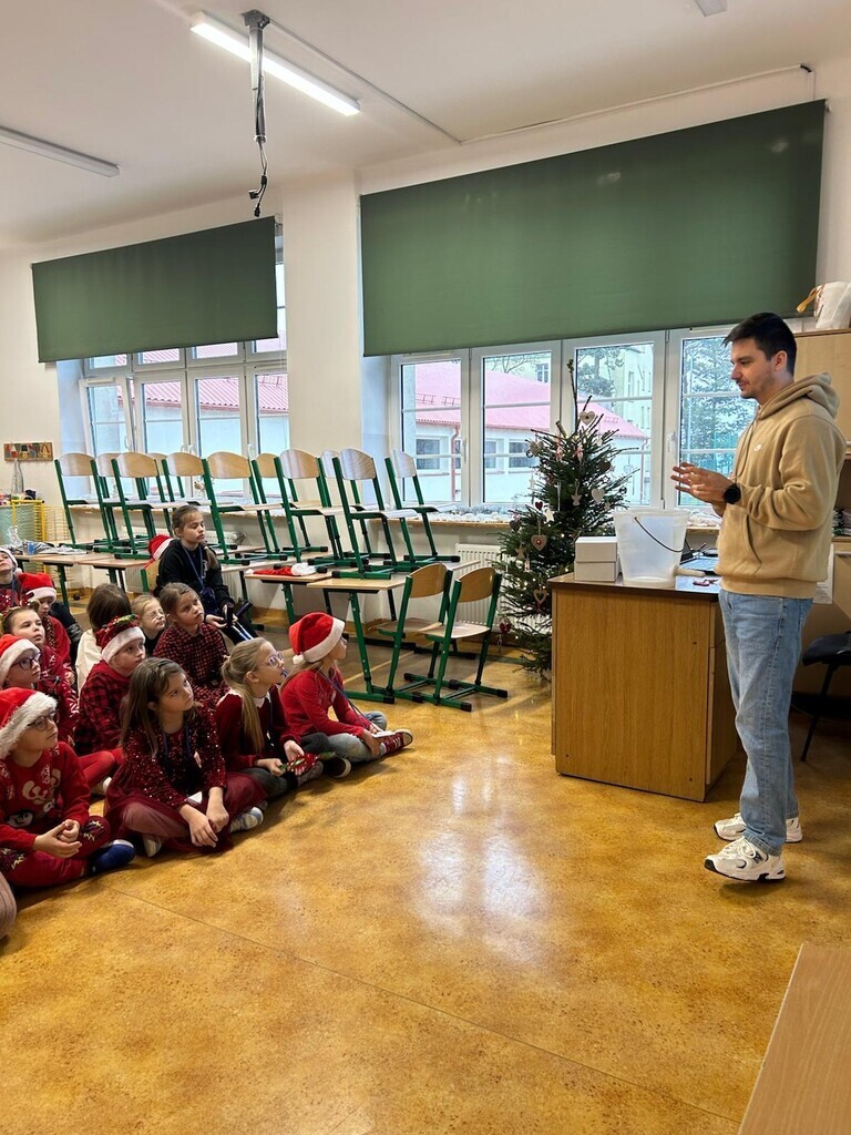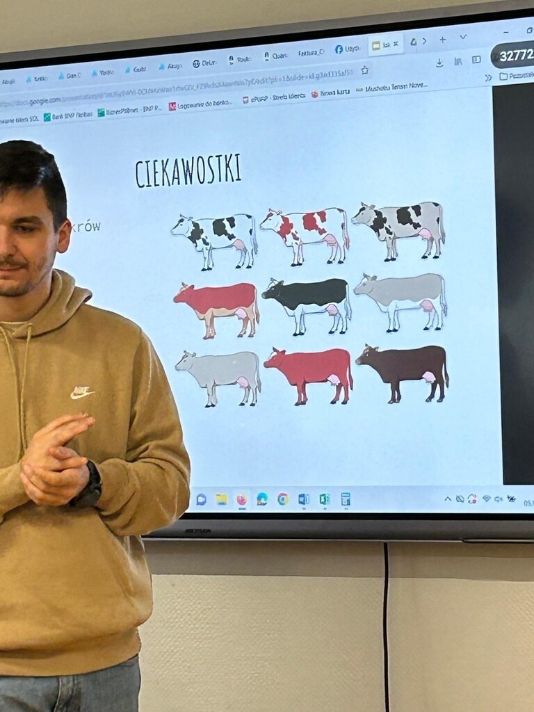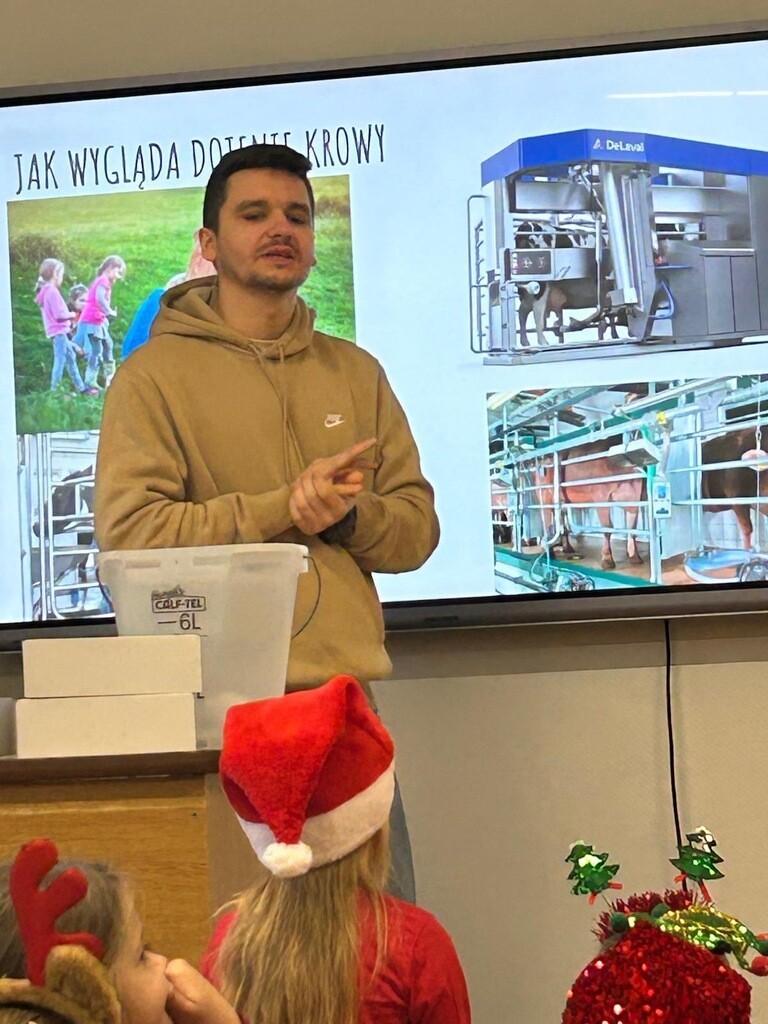 W piątek, 5 grudnia 2025 r., w klasach 2c i 2d odbyło się wyjątkowe spotkanie w ramach programu „Otwarta Firma”. Gościem uczniów był pan Tomek – rolnik z niewielkiej miejscowości oddalonej od Lęborka o około 20 km. Pan Tomek przybliżył dzieciom, jak wygląda życie rolnika oraz jego codzienne obowiązki. Opowiedział o prowadzeniu gospodarstwa, którego głównym celem jest produkcja mleka, a także o obowiązkach związanych z hodowlą krów i uprawą roślin, z których przygotowuje paszę dla bydła. Podkreślił również, jak ważne w jego pracy są odpowiedzialność i systematyczność.
