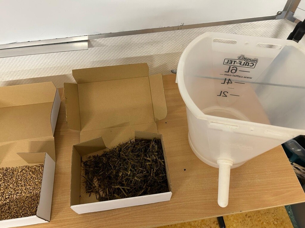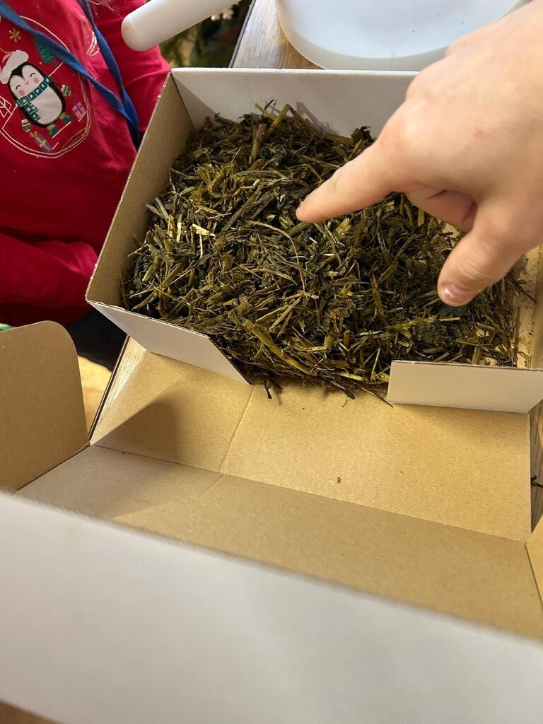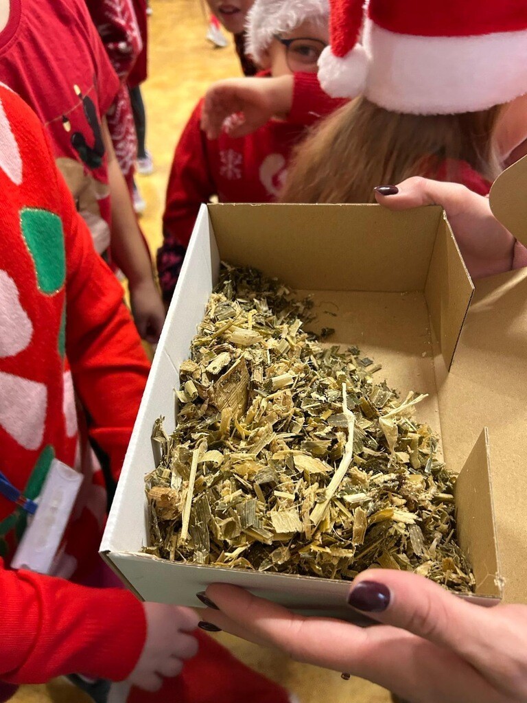 Dzieci mogły dotknąć i powąchać przywiezione przez pana Tomka próbki pokarmu – zboża i kiszonek, którymi karmione są zwierzęta w gospodarstwie.