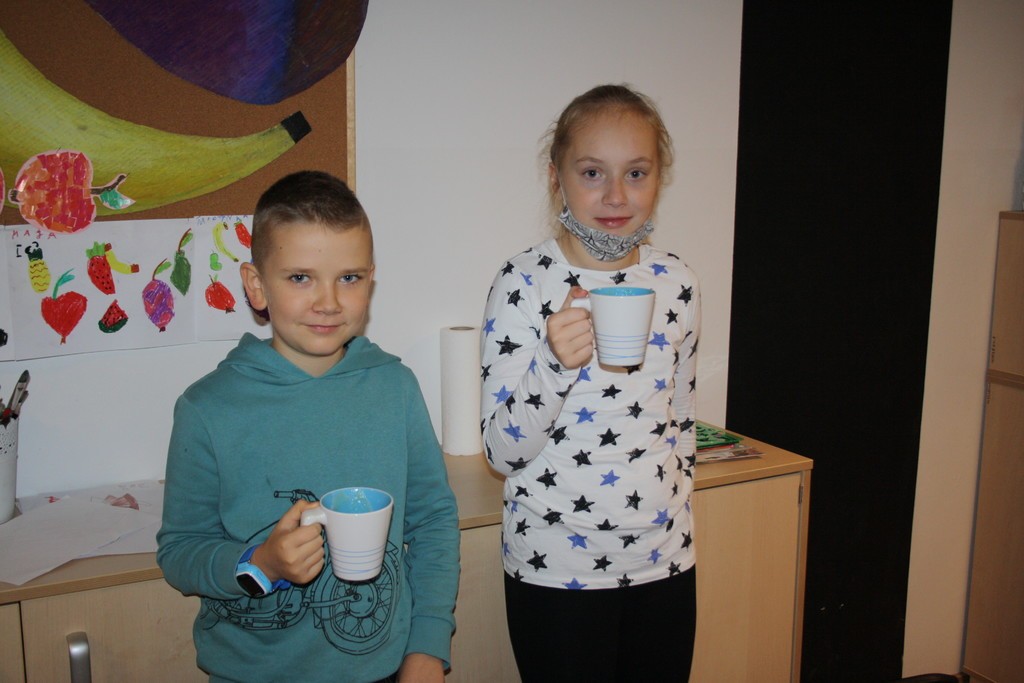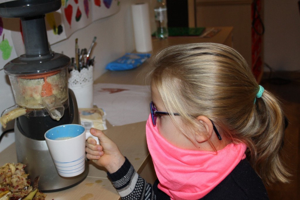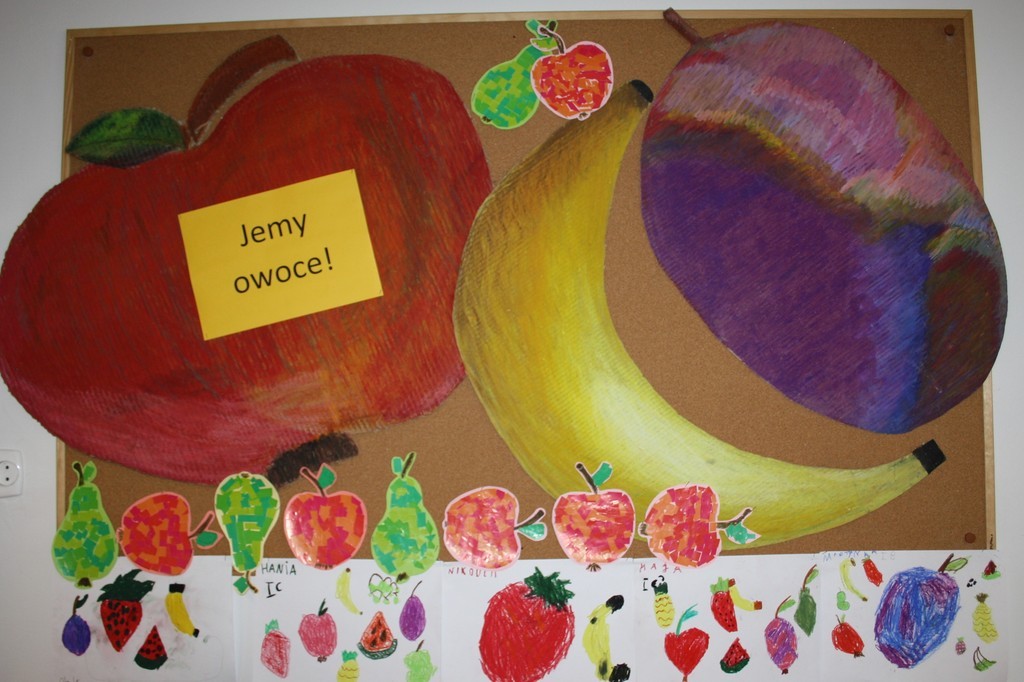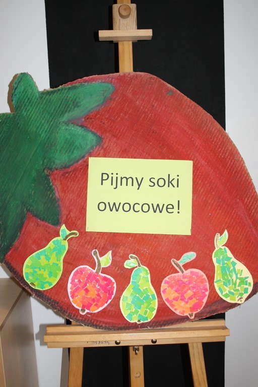 Mamy nadzieję, że wspólne sporządzanie soków owocowych uświadomi naszym wychowankom jak ważne w codziennej diecie są dary natury. Podczas zajęć świetlicowych powstały również owocowo-warzywne prace plastyczne, które zdobią gazetkę ścienną.