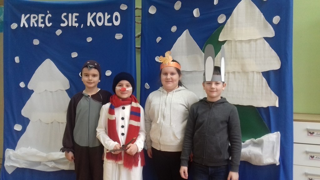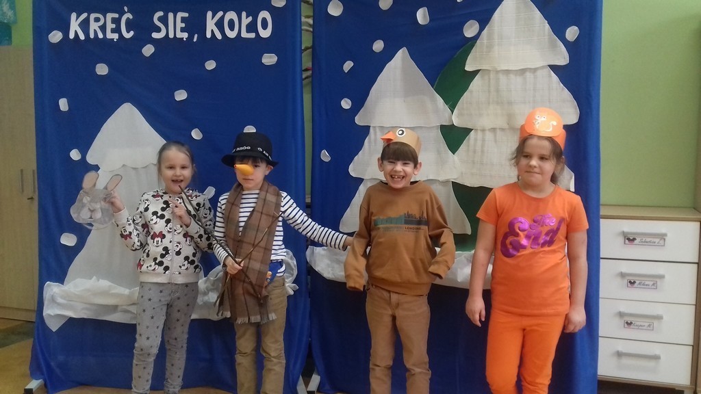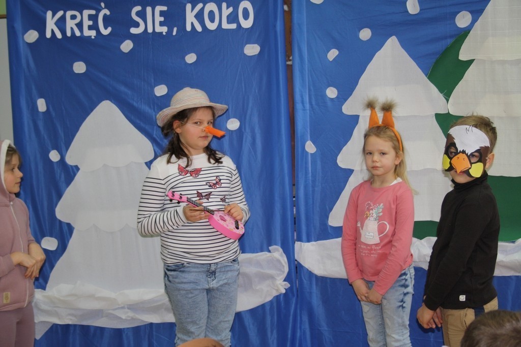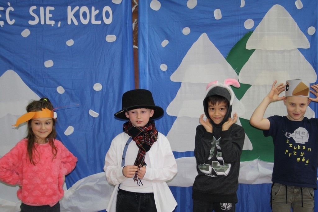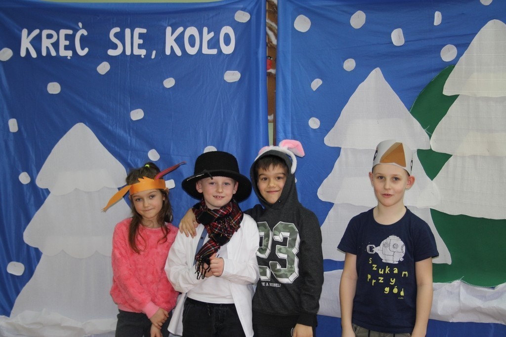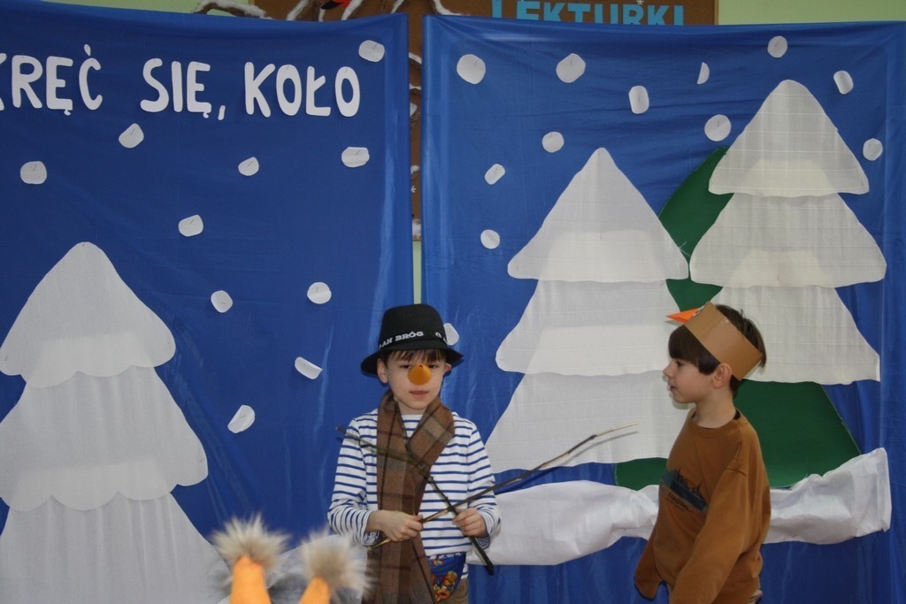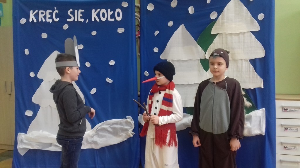 Uczniowie klasy Ia i Ib nie próżnują. Poznając nowe litery oraz omawiając tematy związane z zimą, na chwilę stali się małymi aktorami, a ich sala lekcyjna mini-sceną. Podzieleni na grupy przedstawili inscenizację „Kręć się, koło”. Wcielając się w wybrane przez siebie postaci, opowiedzieli krótką, wierszowaną historię bałwanka, który szukał chętnych do wspólnej zabawy. Wśród nich był wróbelek, wiewiórka oraz zajączek. Dzieci bardzo przeżywały swoje wystąpienia. Jednak, mimo tremy, wszyscy doskonale poradzili sobie z tym zadaniem.