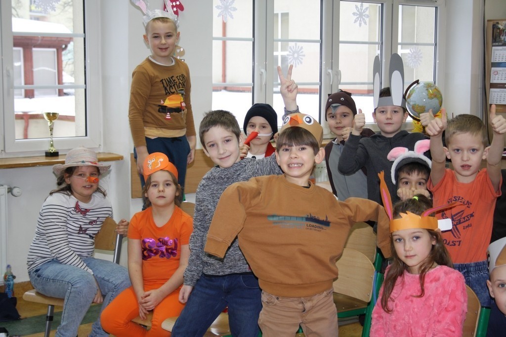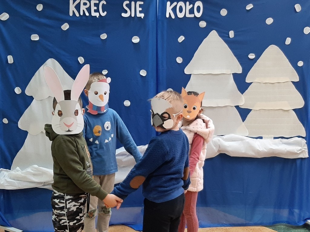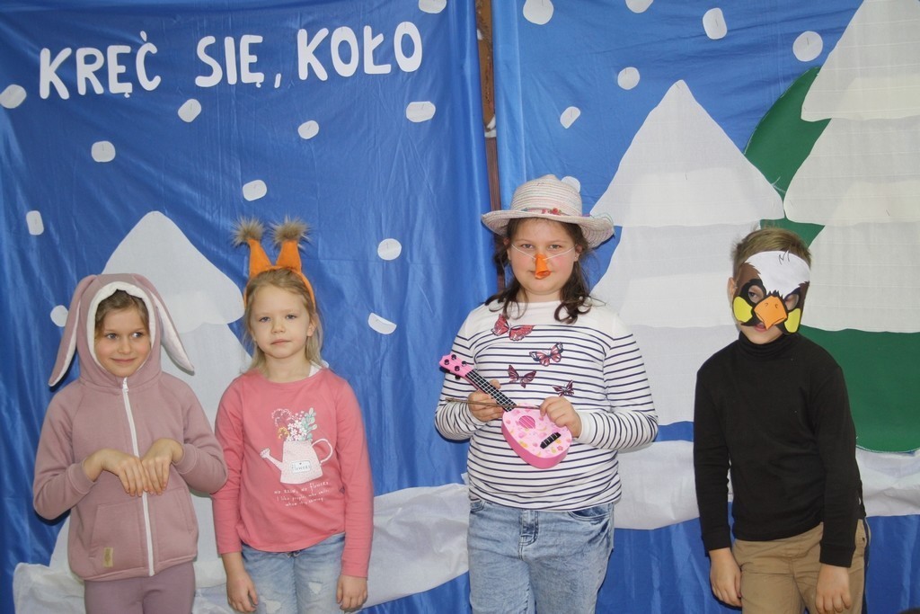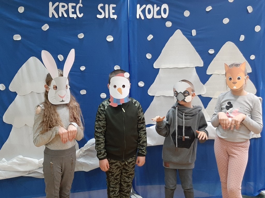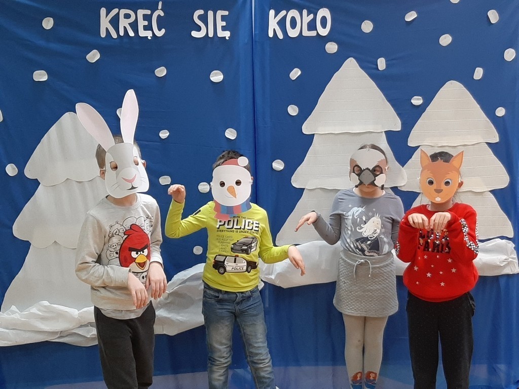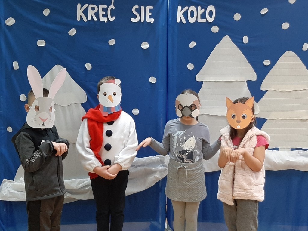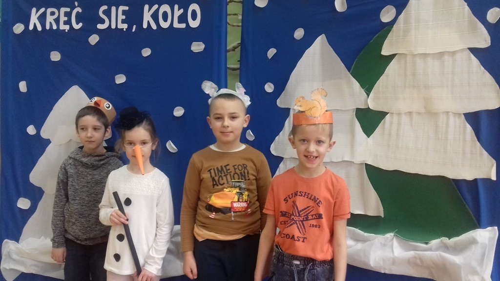 Uczniowie klasy Ia i Ib nie próżnują. Poznając nowe litery oraz omawiając tematy związane z zimą, na chwilę stali się małymi aktorami, a ich sala lekcyjna mini-sceną. Podzieleni na grupy przedstawili inscenizację „Kręć się, koło”. Wcielając się w wybrane przez siebie postaci, opowiedzieli krótką, wierszowaną historię bałwanka, który szukał chętnych do wspólnej zabawy. Wśród nich był wróbelek, wiewiórka oraz zajączek. Dzieci bardzo przeżywały swoje wystąpienia. Jednak, mimo tremy, wszyscy doskonale poradzili sobie z tym zadaniem.
