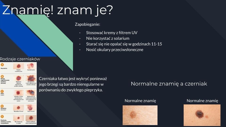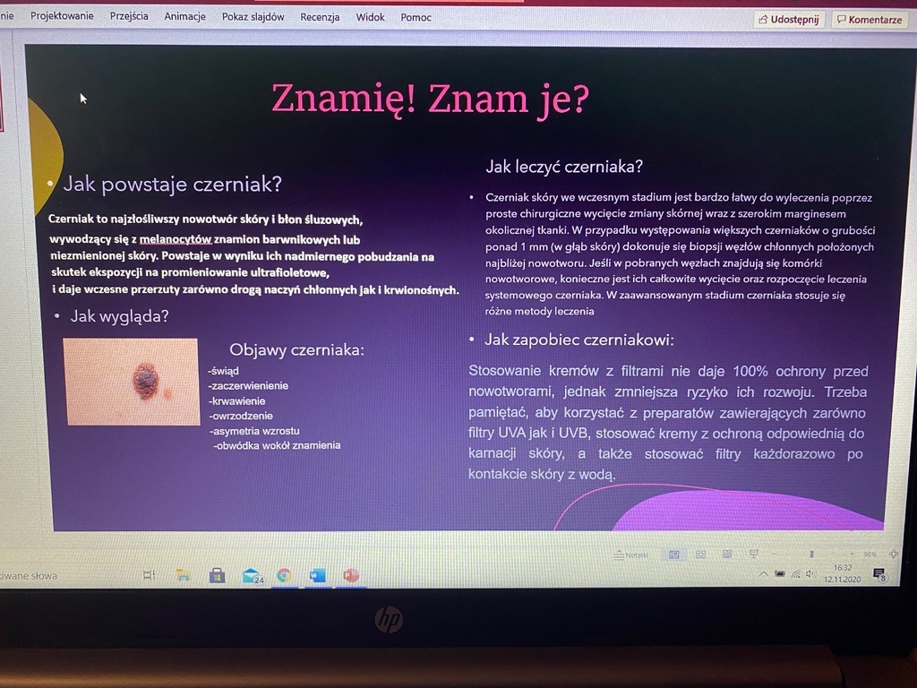 W ramach lekcji biologii uczniowie dowiedzieli się, jakie są przyczyny powstawania czerniaka. Wywołują go szkodliwe promienie ultrafioletowe ,które z powodu dziury ozonowej docierają do nas.