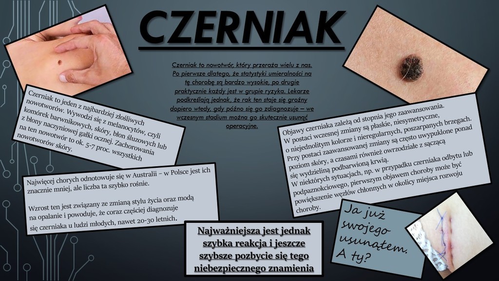 Obecnie czerniak, czyli złośliwy nowotwór skóry jest jednym z groźniejszych zmian, jakie dotykają naszą skórę. Jednak wykryty wcześnie daje prawie stuprocentową wyleczalność.