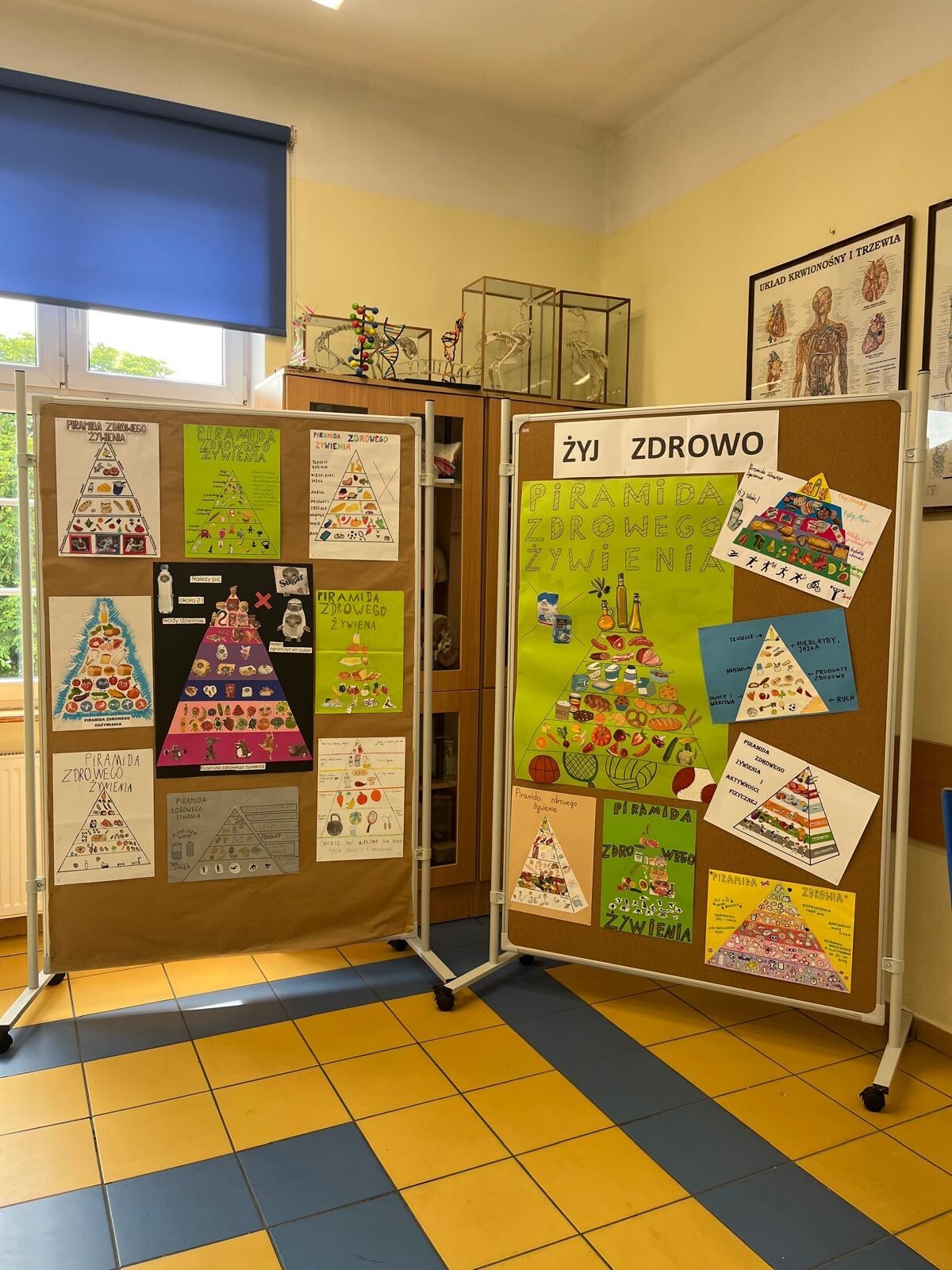 Celem akcji szkolnej jest kształtowanie nawyków zdrowego odżywiania poprzez wzbogacenie wiedzy uczniów o roli i znaczeniu składników odżywczych, zdrowego stylu życia i aktywności fizycznej. W ramach działań promujących zdrowy styl życia wśród naszej szkolnej społeczności została przygotowana gazetka tematyczna. Znalazły się na niej prace uczniów klas siódmych, którzy w bardzo ciekawy i obrazowy sposób przedstawili piramidę żywieniową. Na samym dole piramidy umieścili różnego rodzaju aktywności , które są niezbędnym warunkiem zdrowego stylu życia i znacznie poprawiają naszą kondycję i samopoczucie. Mamy nadzieję , że młodzi ludzie na bieżąco będą wcielać w życie swoje plastyczne wyobrażenia na temat aktywnego trybu życia!