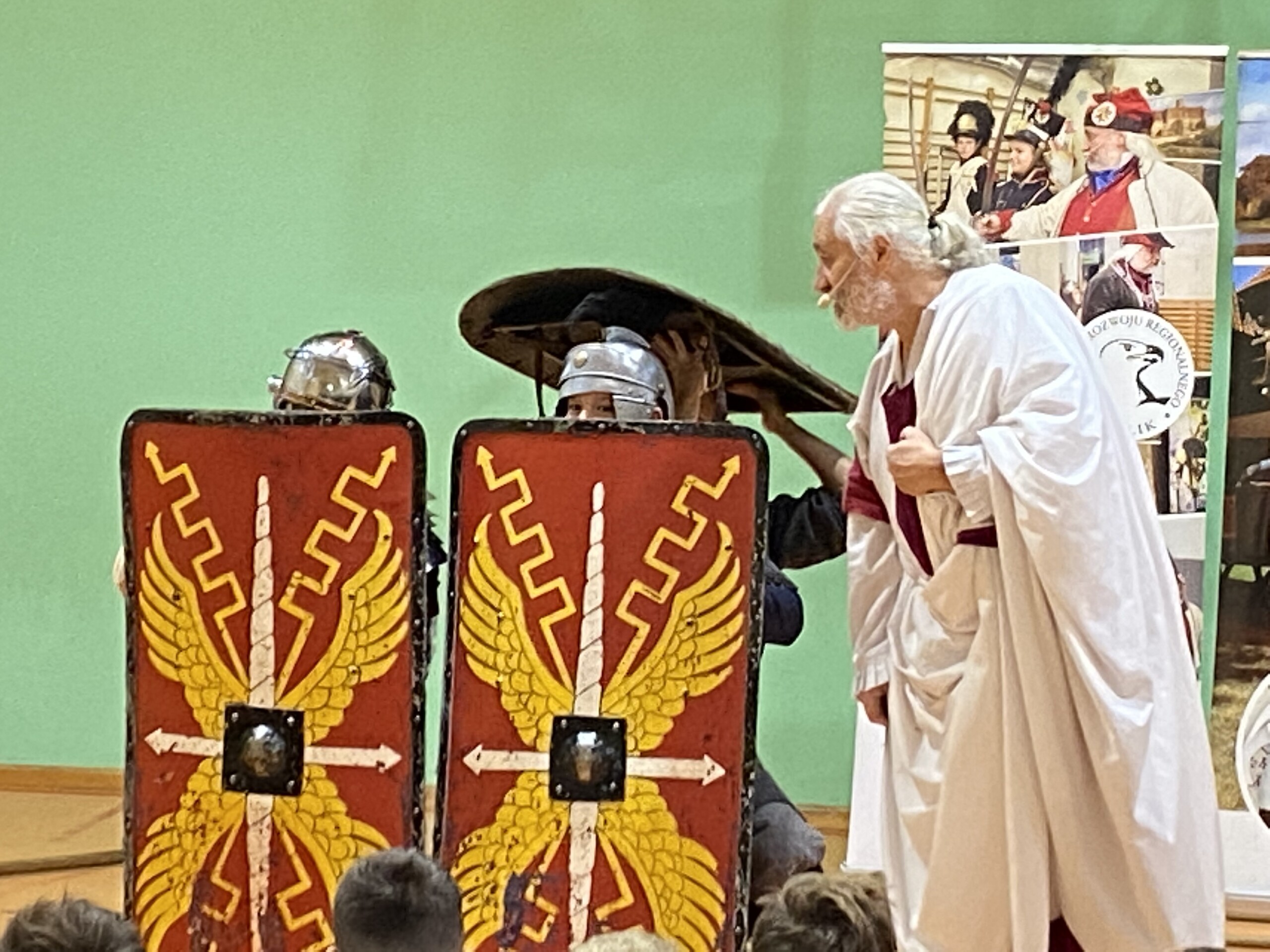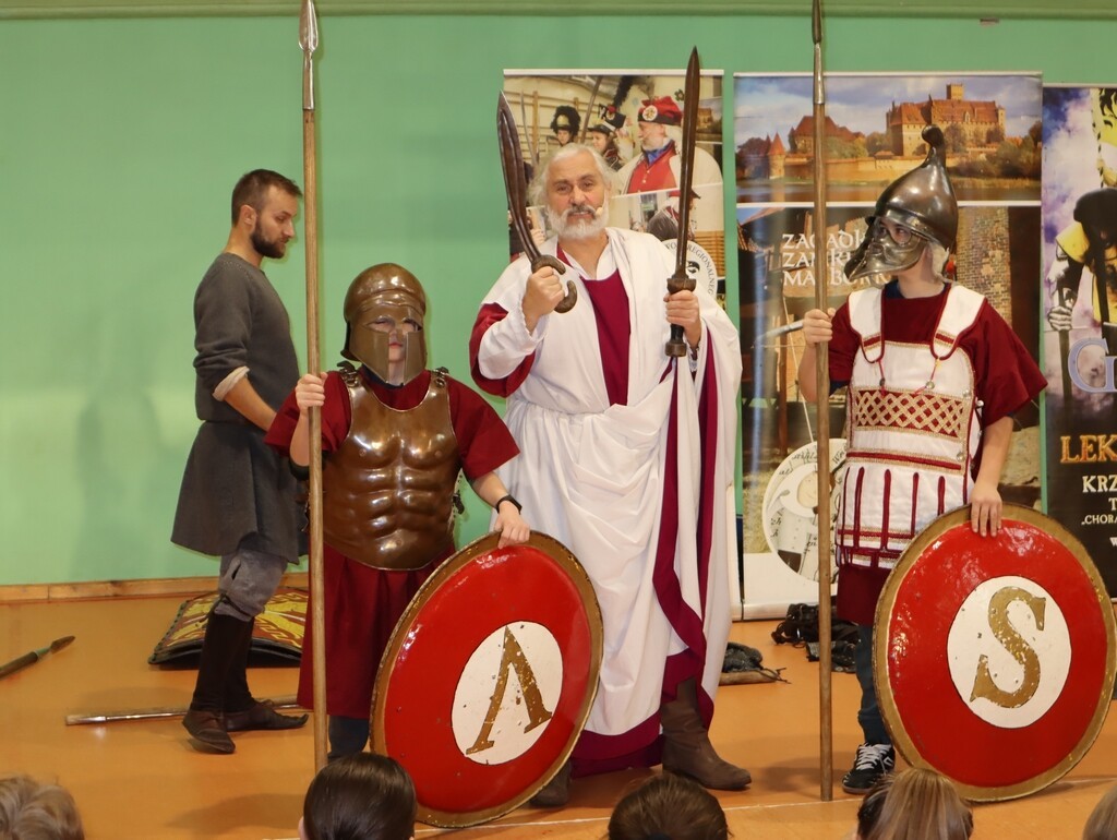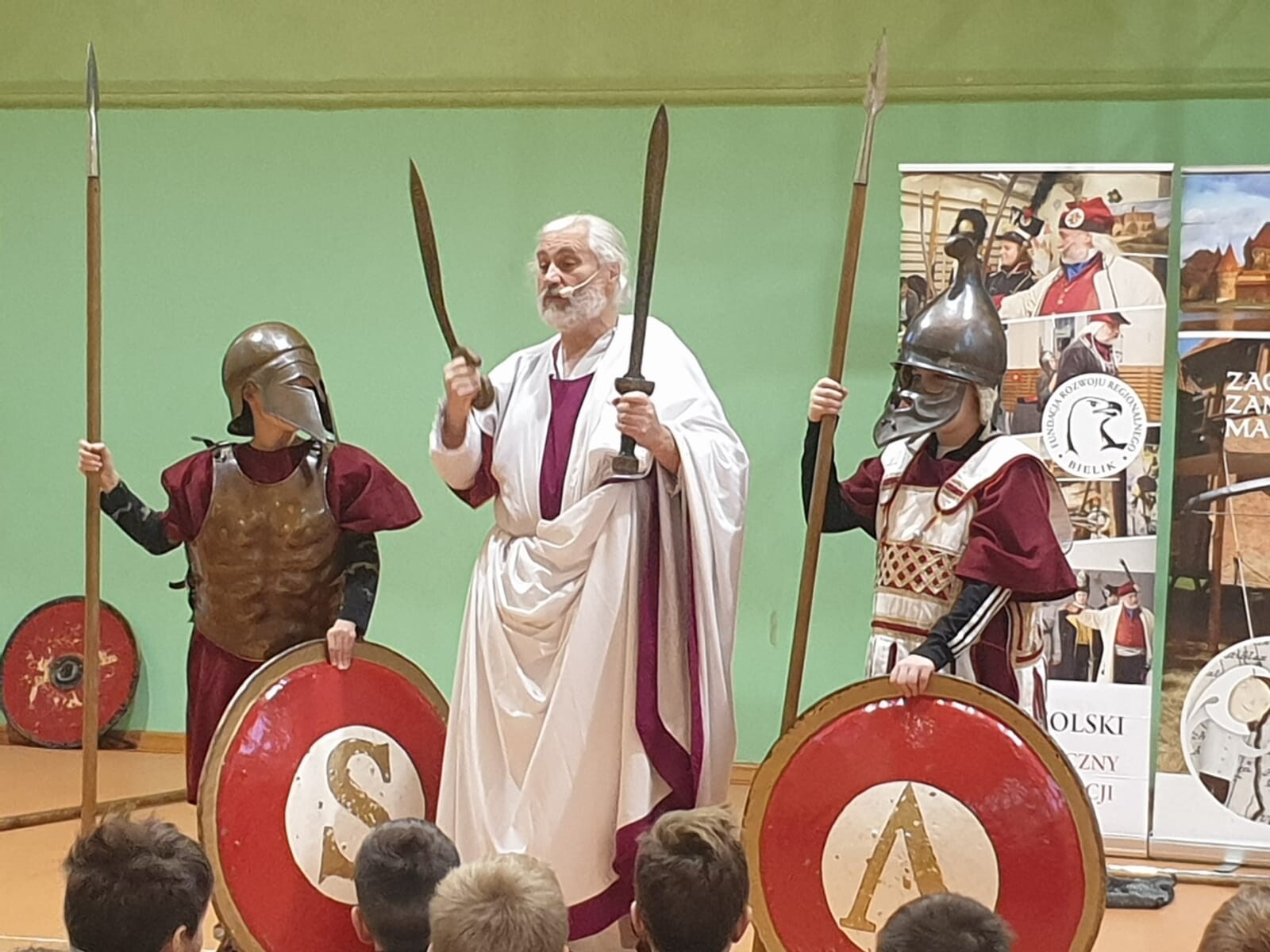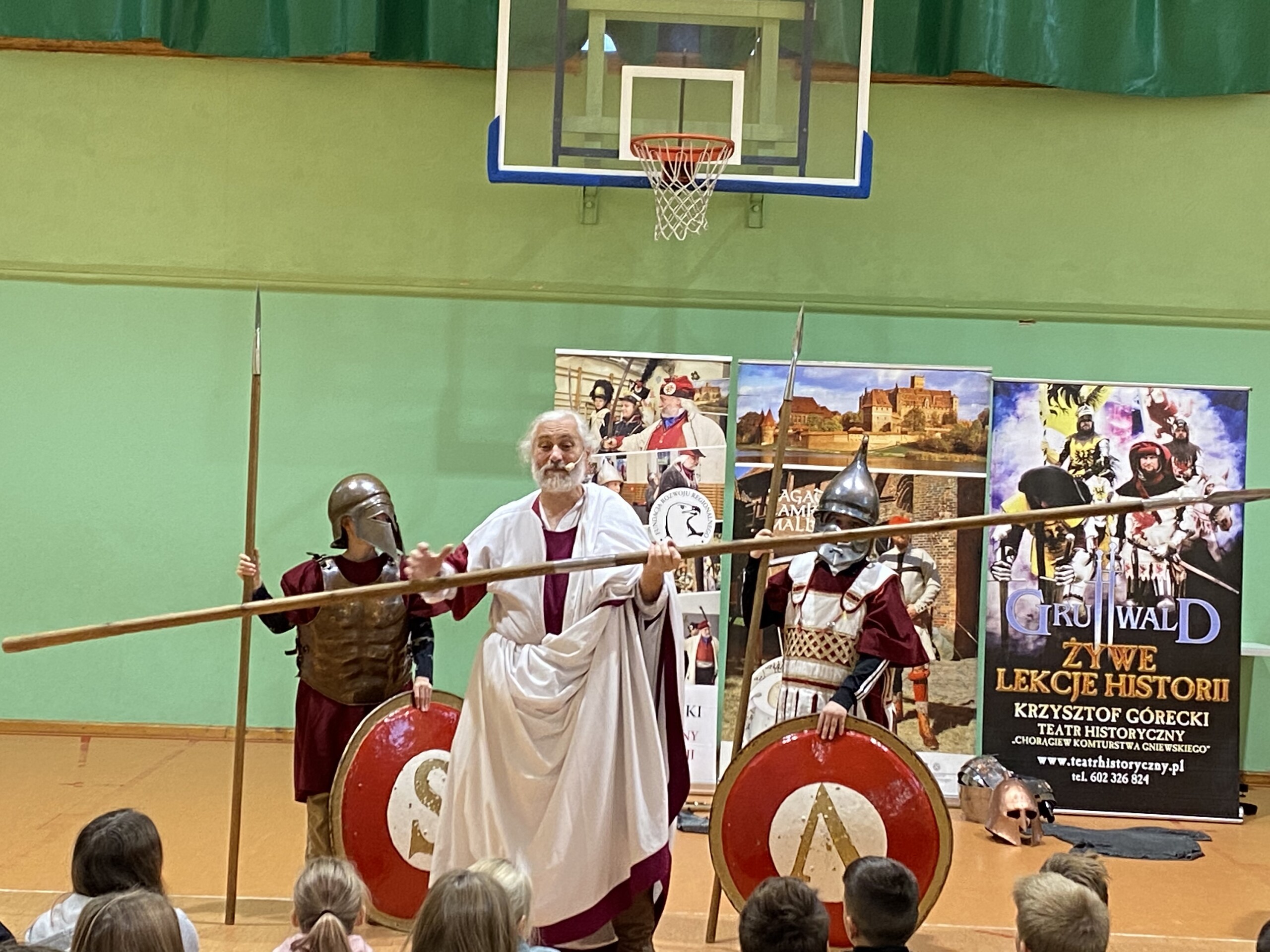 Już po raz kolejny gościliśmy w szkole teatr historyczny p. Krzysztofa Góreckiego. Jego barwne opowieści i anegdoty tym razem dotyczyły czasów starożytnych Greków i Rzymian. Spektakle obejrzeli uczniowie klas IV-VI. Uczestnicy mogli przymierzyć stroje z epoki, zobaczyć broń grecką i rzymską oraz przyjrzeć się uzbrojeniu gladiatorów. To dobry sposób na propagowanie historii, która wcale nie musi być nudna. Uśmiechy na twarzach naszych uczniów były na to najlepszym dowodem.