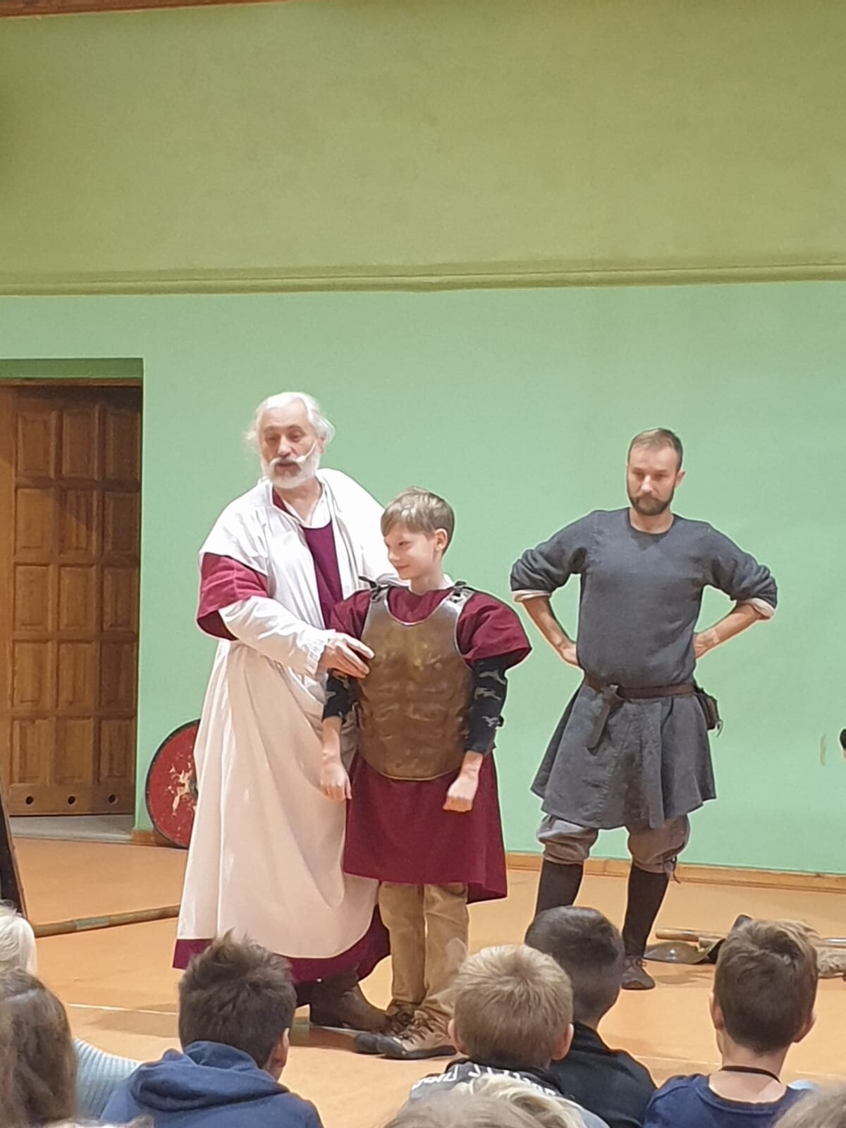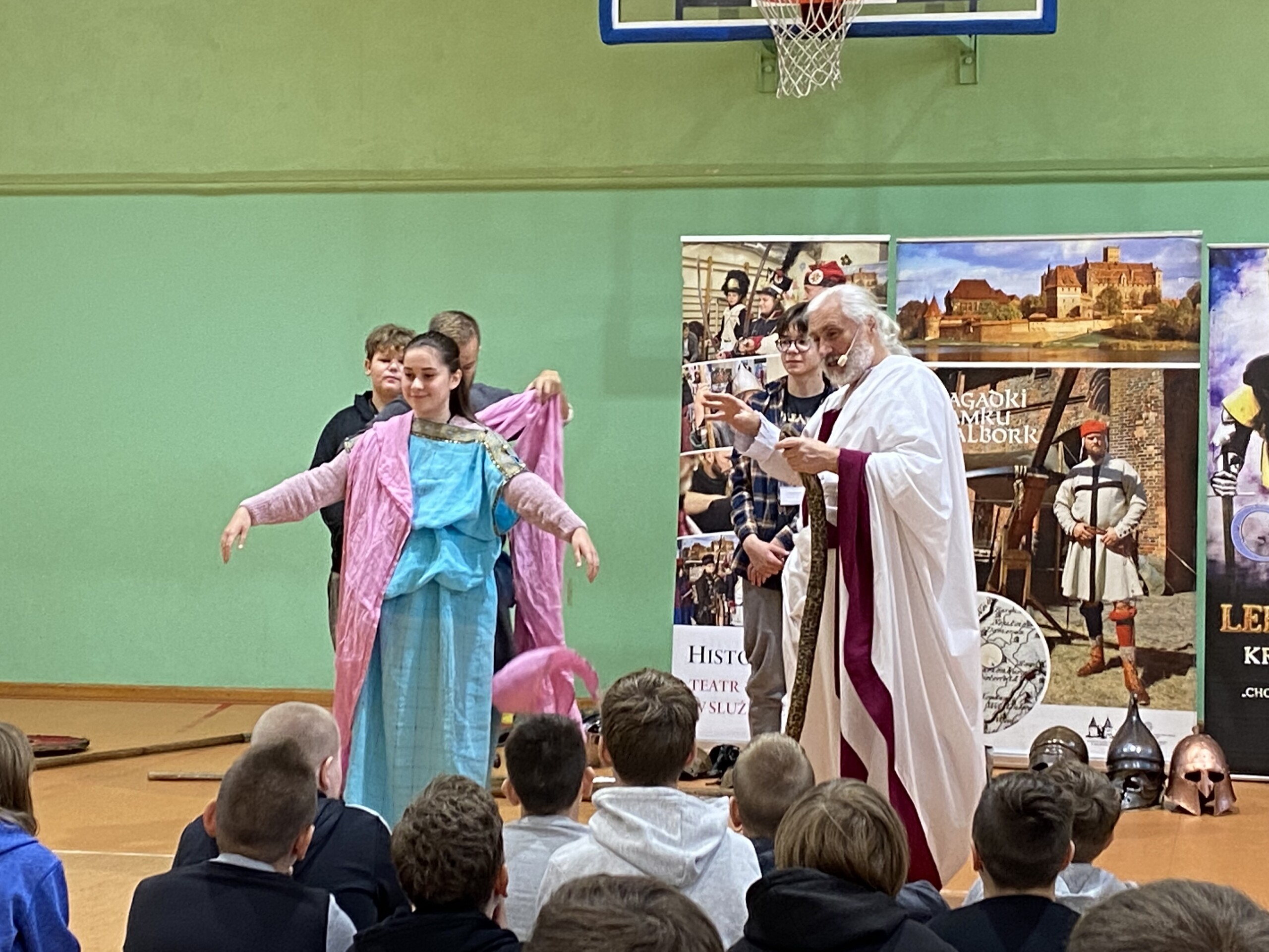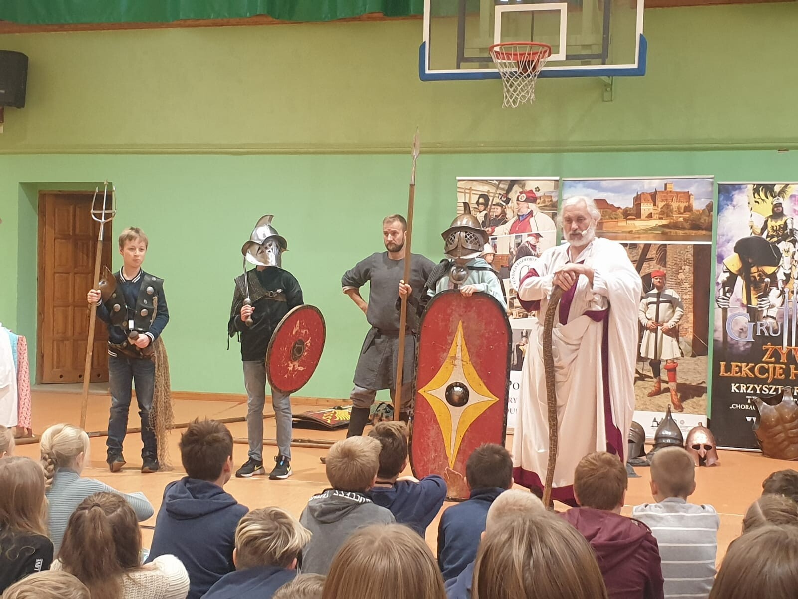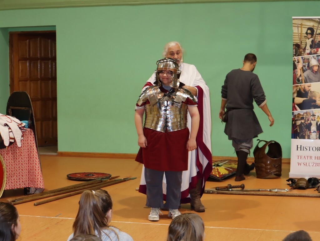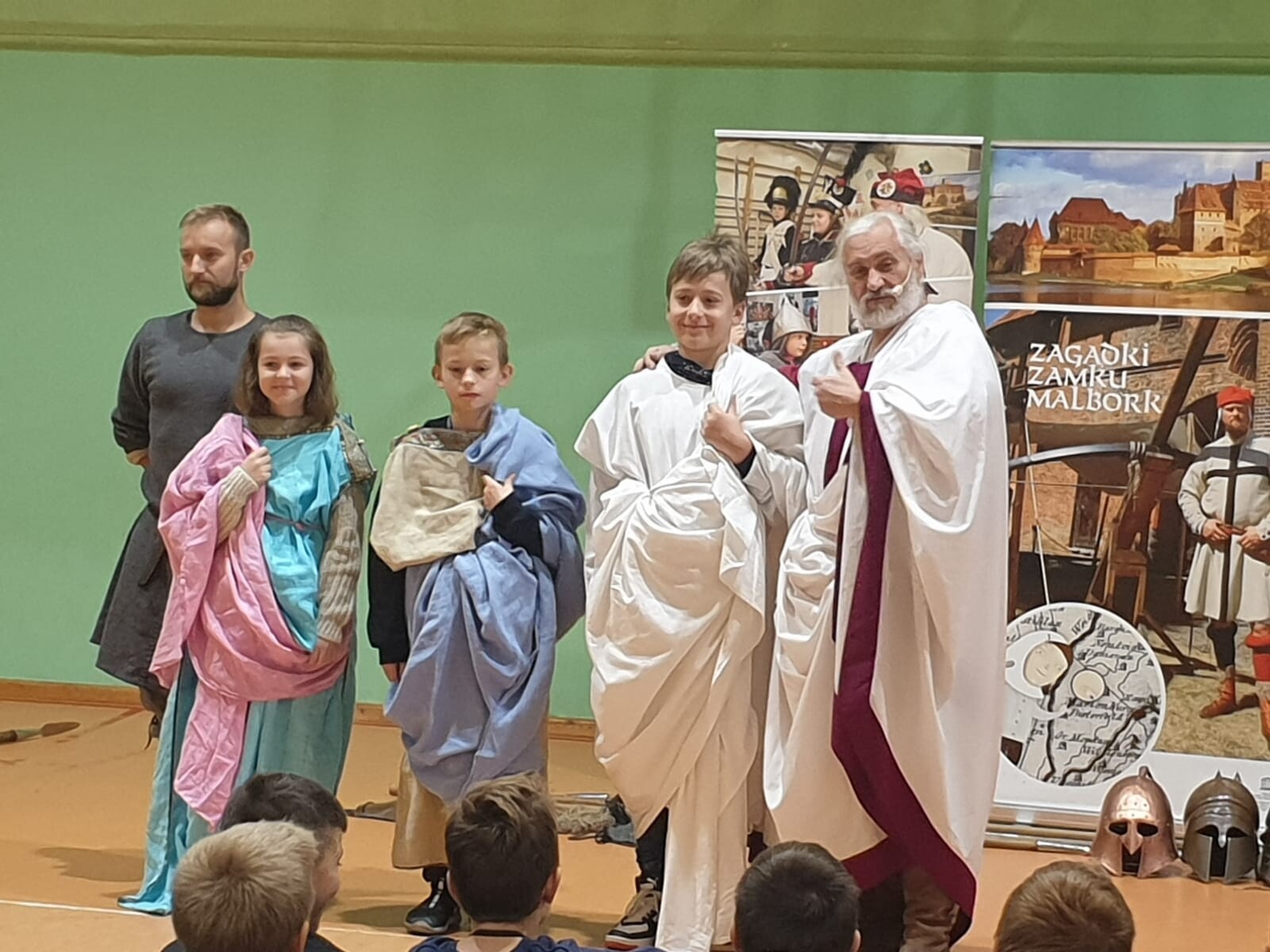 Już po raz kolejny gościliśmy w szkole teatr historyczny p. Krzysztofa Góreckiego. Jego barwne opowieści i anegdoty tym razem dotyczyły czasów starożytnych Greków i Rzymian. Spektakle obejrzeli uczniowie klas IV-VI. Uczestnicy mogli przymierzyć stroje z epoki, zobaczyć broń grecką i rzymską oraz przyjrzeć się uzbrojeniu gladiatorów. To dobry sposób na propagowanie historii, która wcale nie musi być nudna. Uśmiechy na twarzach naszych uczniów były na to najlepszym dowodem.