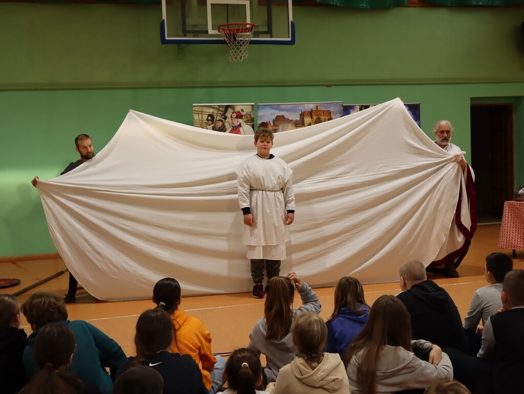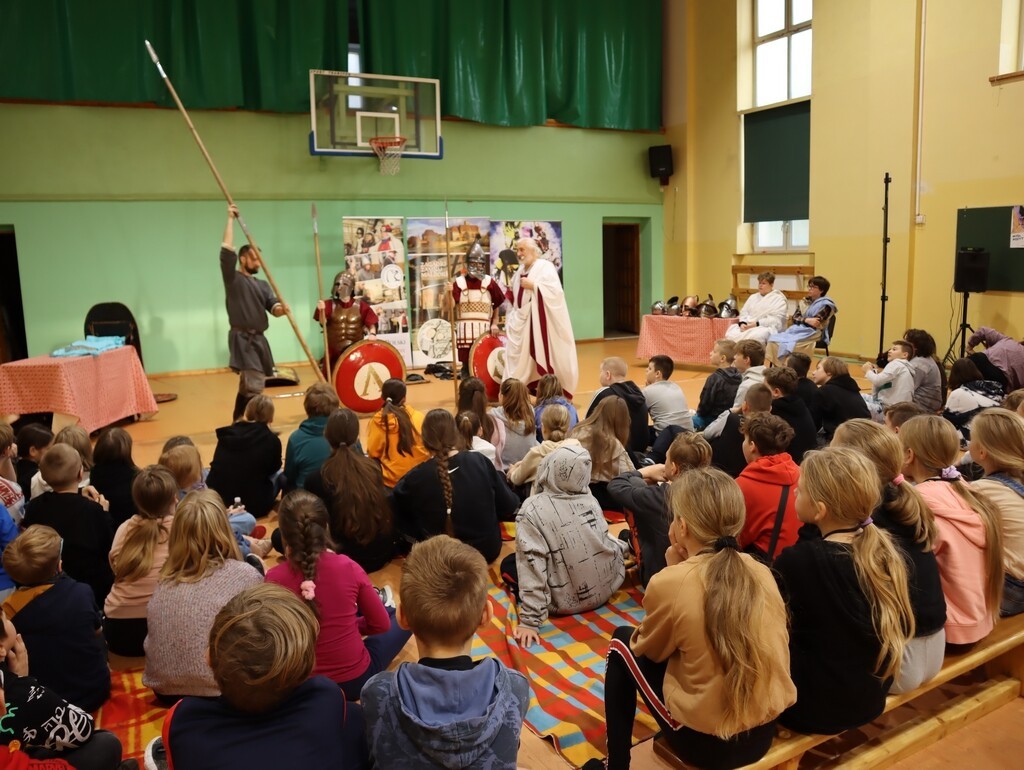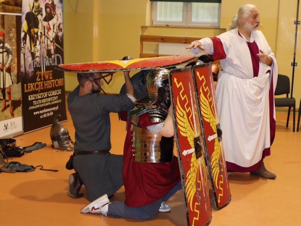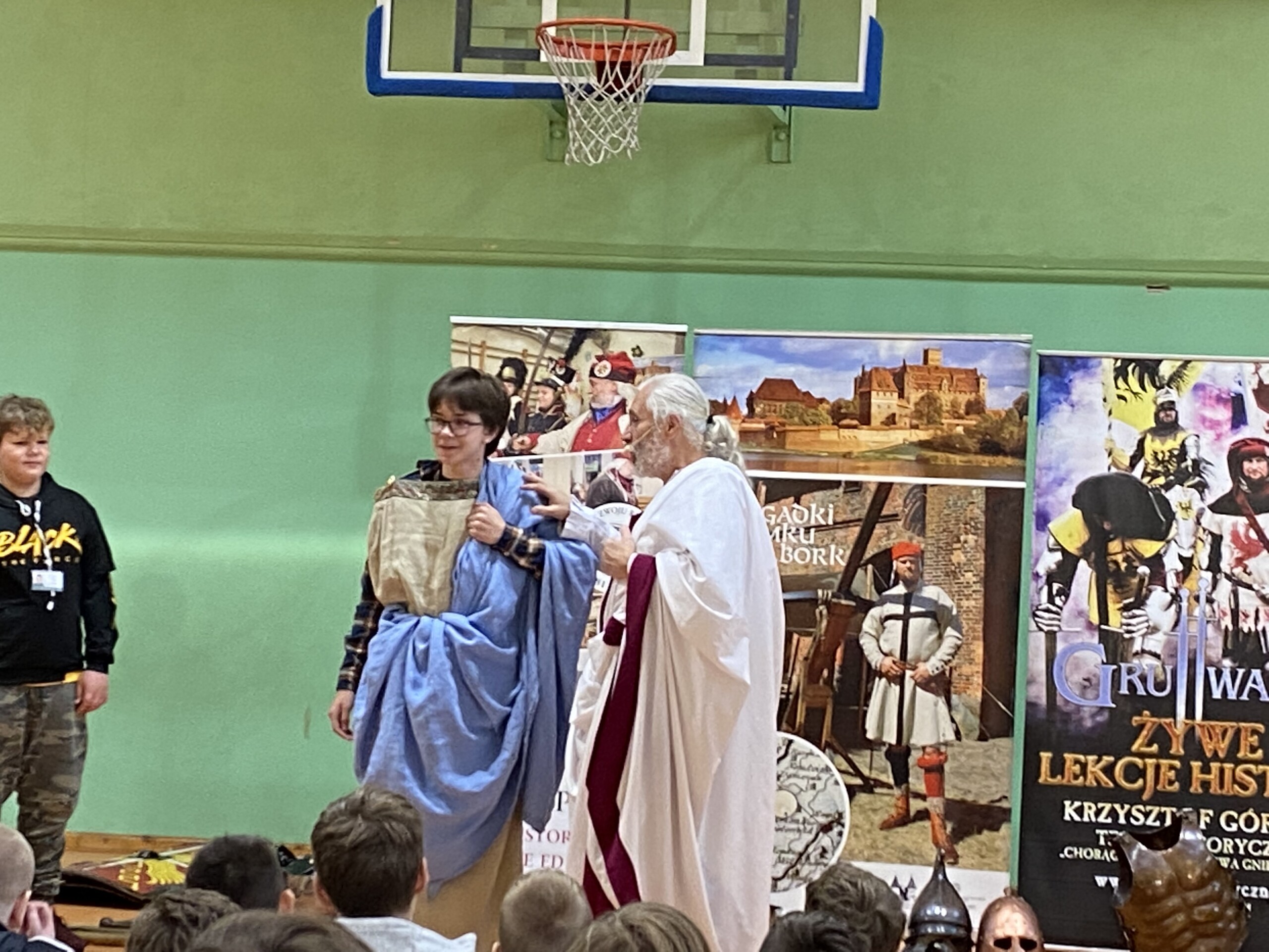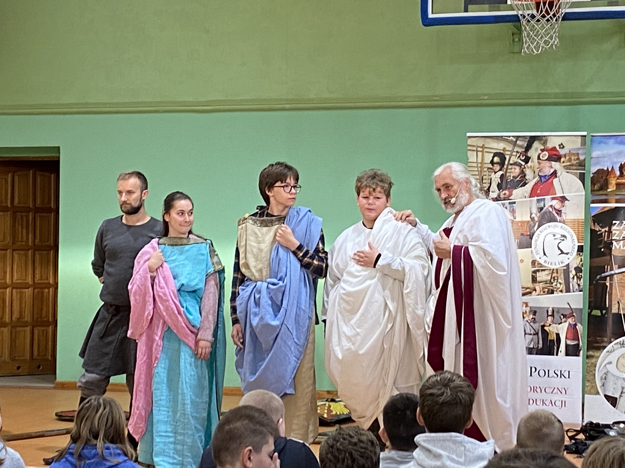 Już po raz kolejny gościliśmy w szkole teatr historyczny p. Krzysztofa Góreckiego. Jego barwne opowieści i anegdoty tym razem dotyczyły czasów starożytnych Greków i Rzymian. Spektakle obejrzeli uczniowie klas IV-VI. Uczestnicy mogli przymierzyć stroje z epoki, zobaczyć broń grecką i rzymską oraz przyjrzeć się uzbrojeniu gladiatorów. To dobry sposób na propagowanie historii, która wcale nie musi być nudna. Uśmiechy na twarzach naszych uczniów były na to najlepszym dowodem.