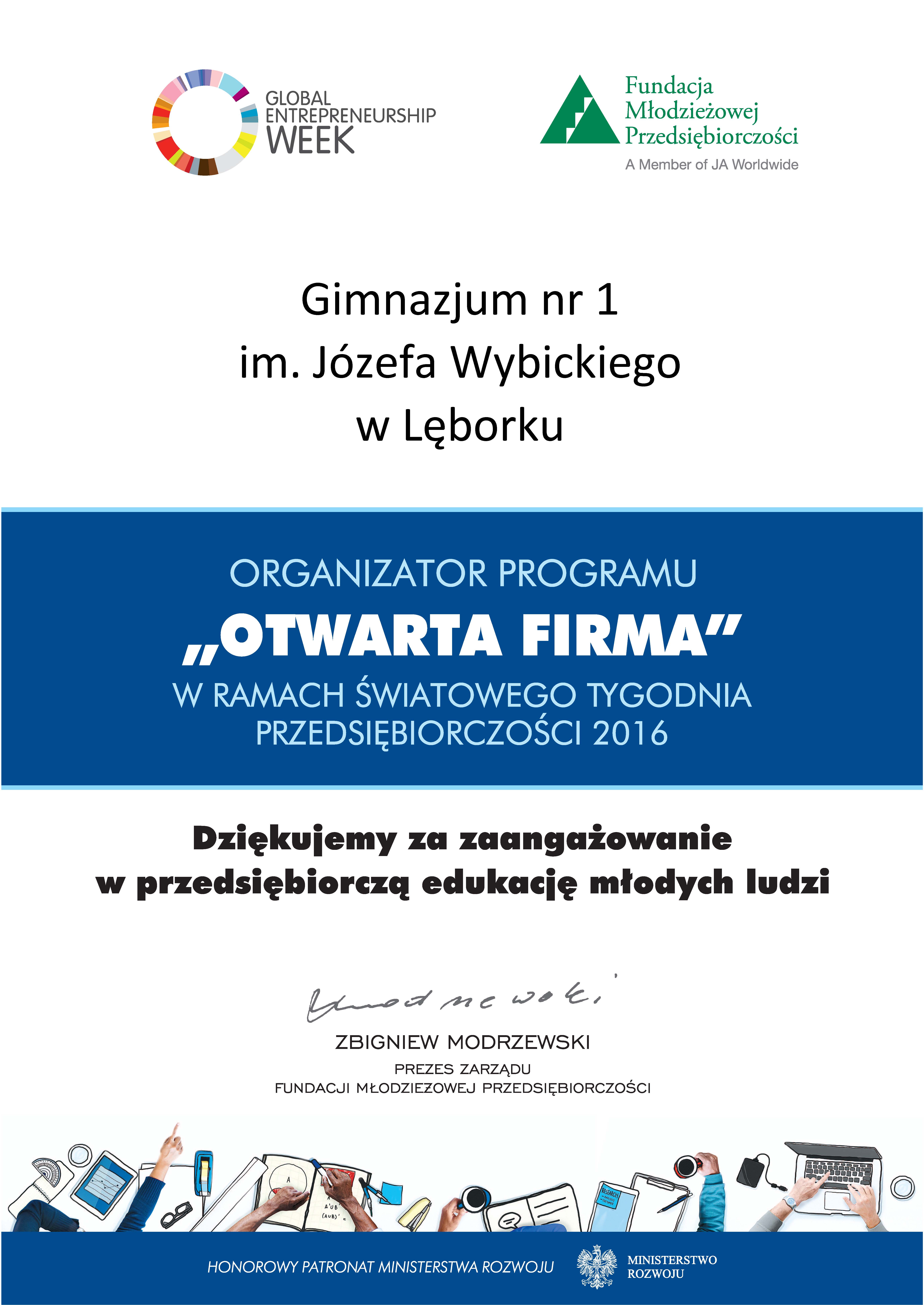 W tym roku nasze gimnazjum przystąpiło również do konkursu na Najaktywniejszą Szkołę w ramach programu Otwarta Firma, którego organizatorem jest Fundacja Młodzieżowej Przedsiębiorczości.