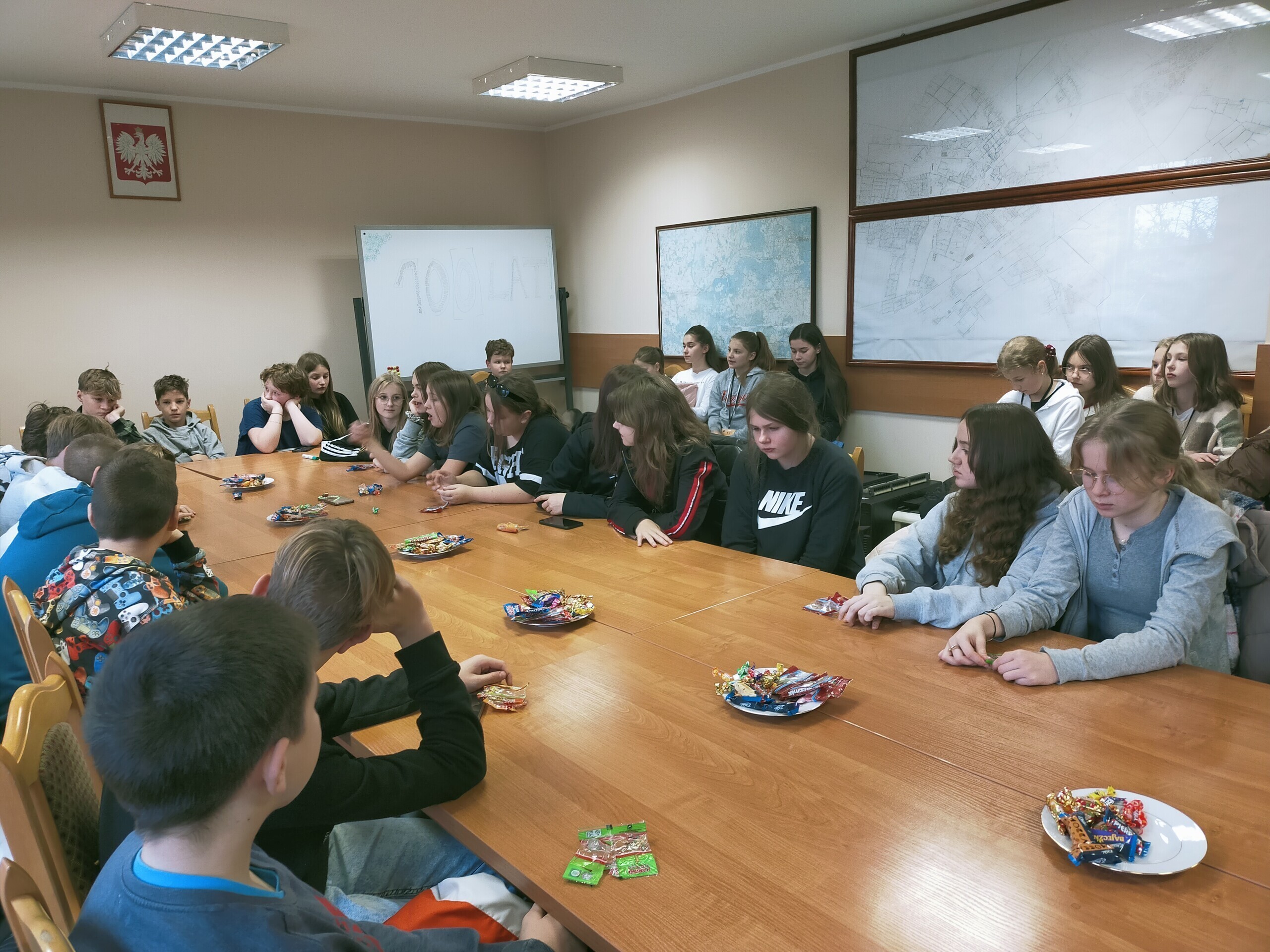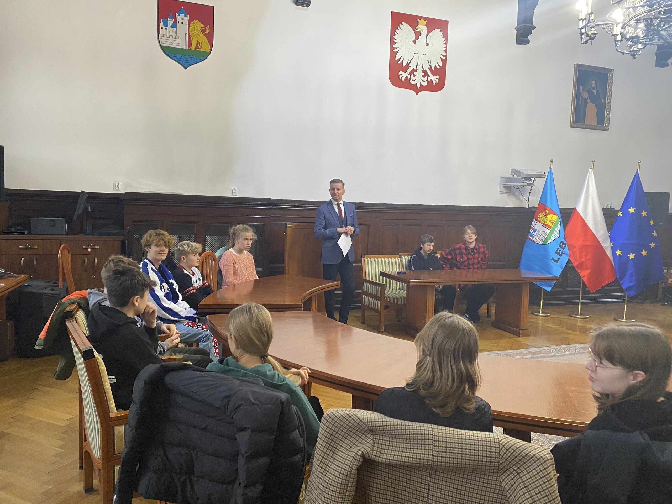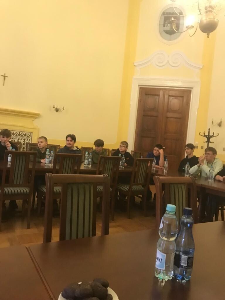 Kolejnym przystankiem, w realizowanym w szkole projekcie ,,Otwarta firma” ,okazał się lęborski ratusz. Uczniowie klasy VIII d swoje spotkanie rozpoczęli w reprezentacyjnej Sali Rajców. Spotkanie z młodzieżą rozpoczął Burmistrz Witold Namyślak, który powitał młodzież i wyjaśnił ,że na co dzień w tym miejscu odbywają się spotkania Rady Miasta. Zachęcił młodzież do aktywności obywatelskiej na rzecz swojej małej ojczyzny.