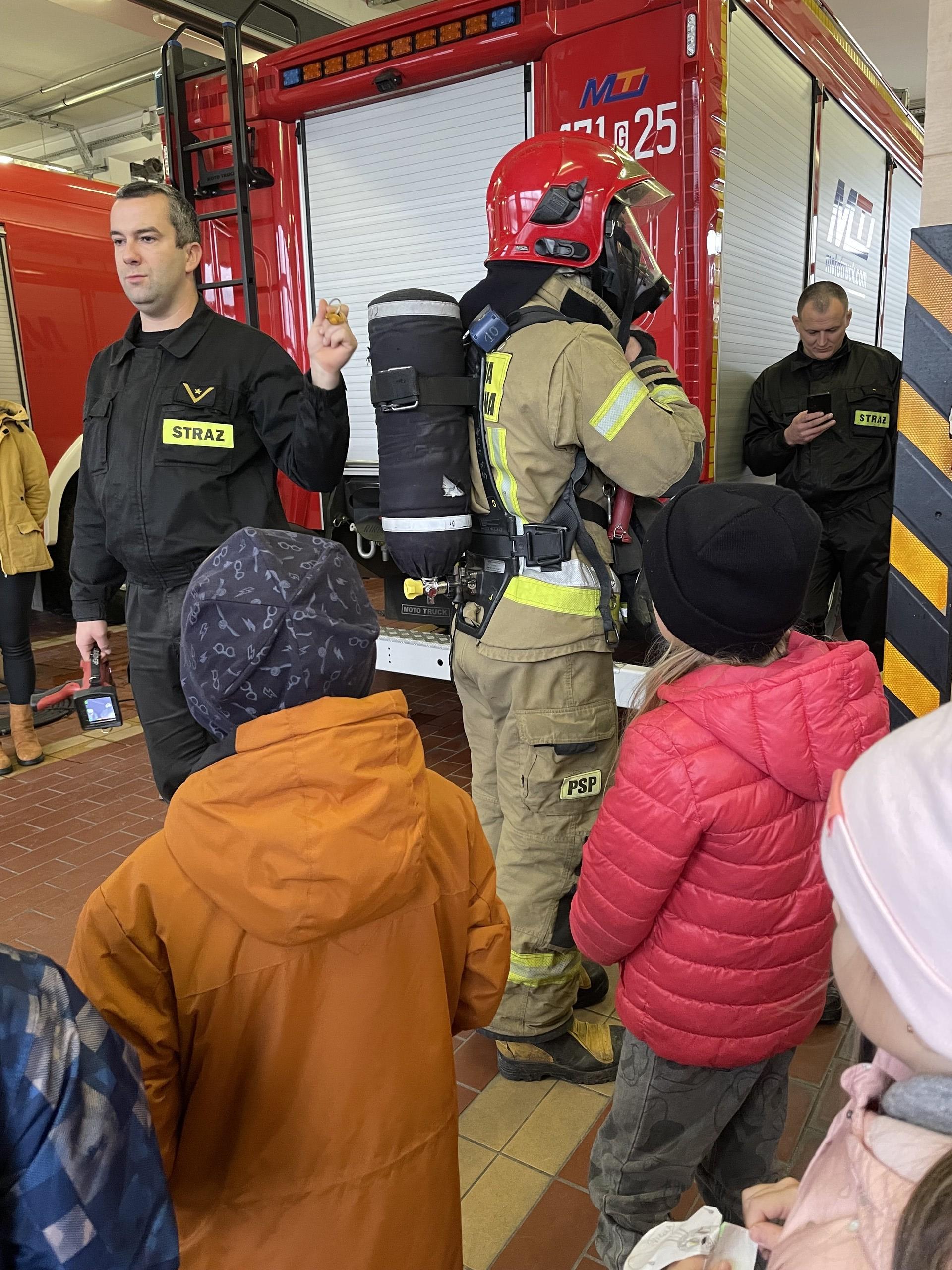 16 listopada br. pierwszoklasiści udali się do siedziby Komendy Powiatowej Państwowej Straży Pożarnej w Lęborku, która przyjęła nasze zaproszenie w ramach programu Otwarta firma. Dla siedmiolatków była to lekcja niezapomnianych wrażeń. Uczniowie dowiedzieli się wielu cennych informacji na temat niełatwej pracy strażaków – np., że w przypadku zgłoszenia pożaru panowie mają minutę czasu na przebranie się… Muszą również ćwiczyć, żeby być w formie. Strażacy zaprezentowali strój używany podczas akcji oraz kamerę, która pozwala na szybkie odnalezienie człowieka bądź zwierzęcia w pomieszczeniu o bardzo dużym zadymieniu. W pracy strażaka bardzo ważne jest dbanie o porządek i odkładanie sprzętów na miejsce. Oprócz wozów strażackich, komenda posiada również motorówkę oraz łódź i każda z nich służy do oddzielnej akcji na morzu i nad jeziorem.