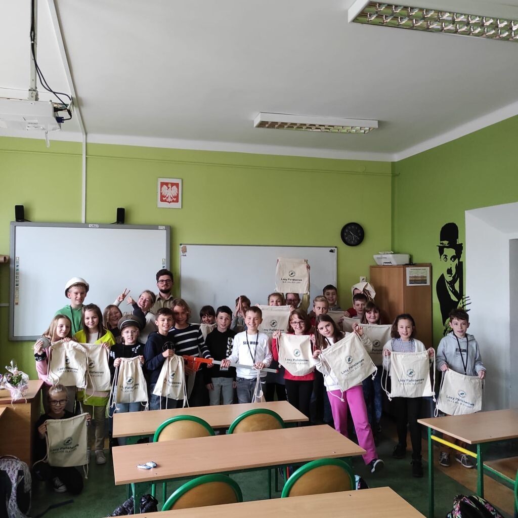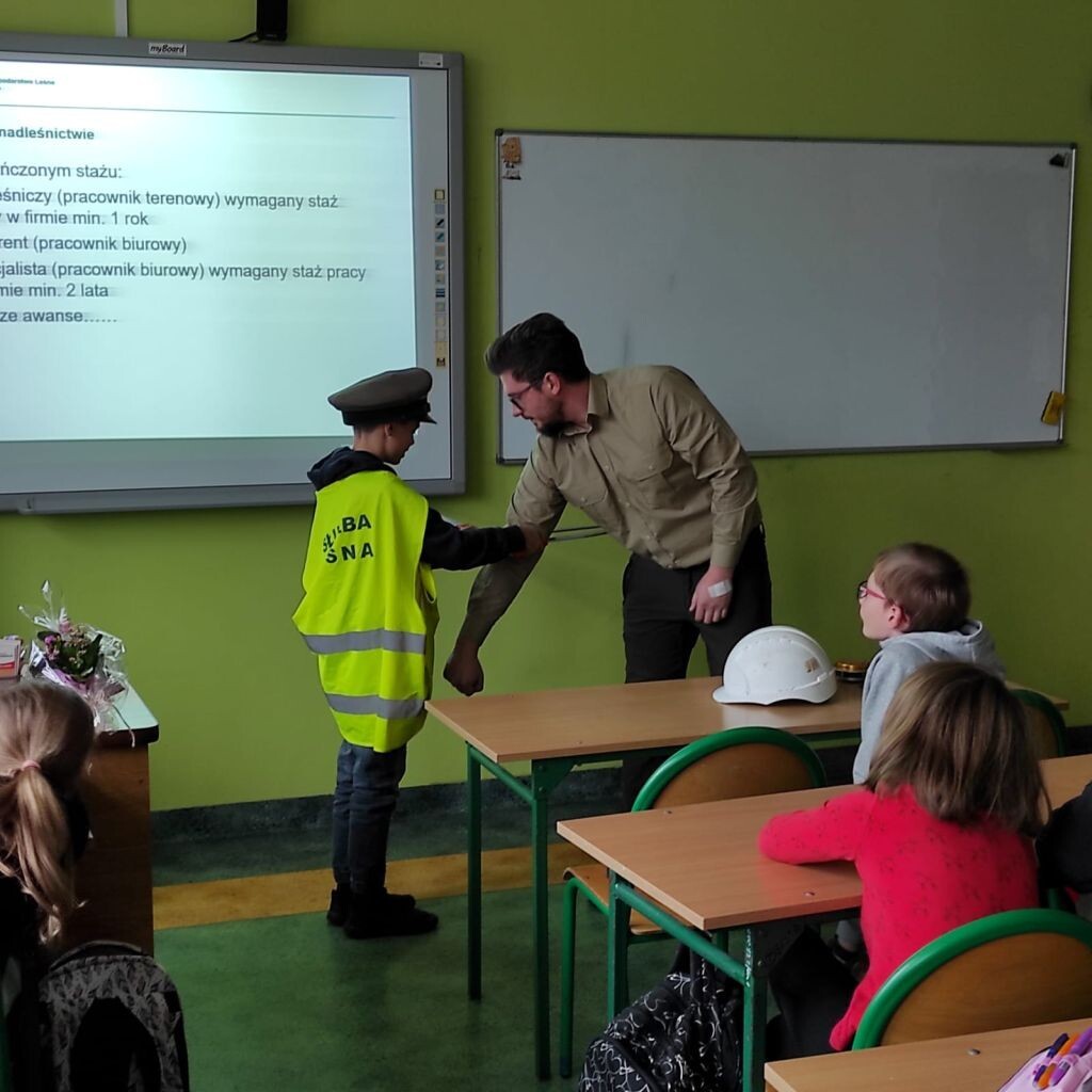Dnia 16 listopada br. uczniowie klasy 4a uczestniczyli w spotkaniu z panem Michałem Lenartem- podleśniczym z Nadleśnictwa Lębork w ramach projektu Otwarta firma. Uczniowie dowiedzieli się między innymi o tym, jakie wykształcenie wymagane jest na stanowisku leśniczego oraz jakie są obowiązki pracownika nadleśnictwa. Podczas zajęć uczniowie posługiwali się taśmą mierniczą oraz średnicomierzem. Okazało się, ze w pracy leśnika ważna jest nie tylko posiadana wiedza, ale także kondycja fizyczna, ponieważ dużo czasu spędza się w terenie. Przestrzeganie zasad bezpieczeństwa ma w tej pracy ogromne znaczenie. Miłym akcentem na zakończenie spotkania było otrzymanie przez uczniów słodkiego upominku oraz worków z logo Nadleśnictwa Lębork.