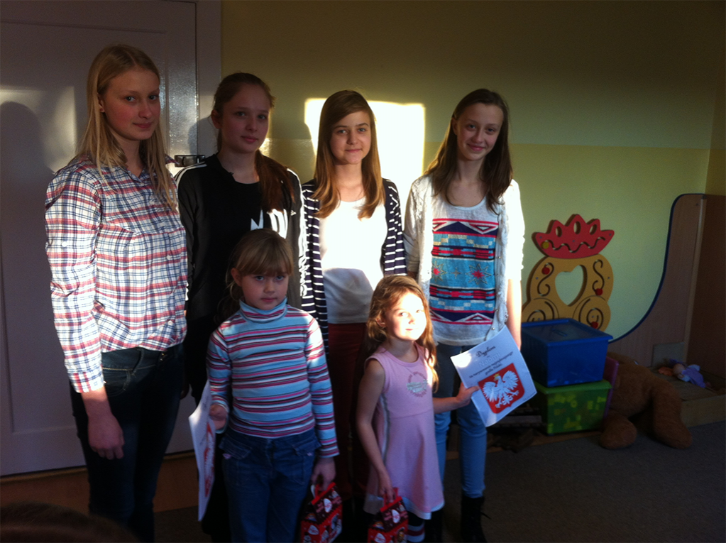 Z inicjatywy wolontariuszek w grupie przedszkolaków lęborskiego Przedszkola nr 10 ogłoszony został konkurs na najpiękniejszy rysunek przedstawiający wizerunek orła białego. Wśród wielu prac – Monika, Julia, Wiktoria i Michalina ( wolontariuszki z Gimnazjum nr 1 ) wybrały dwie piękne prace, których autorki zostały nagrodzone dyplomami i słodkimi upominkami.